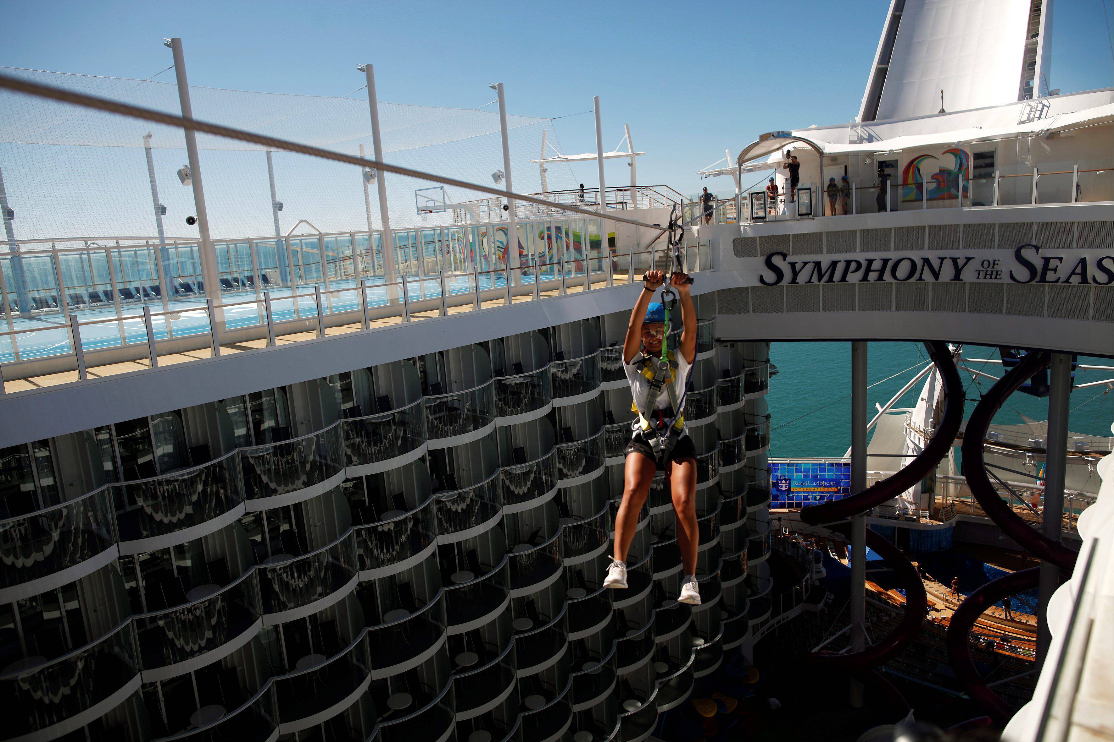 Un pasajero practica tirolina en lo alto del Symphony of the Seas.