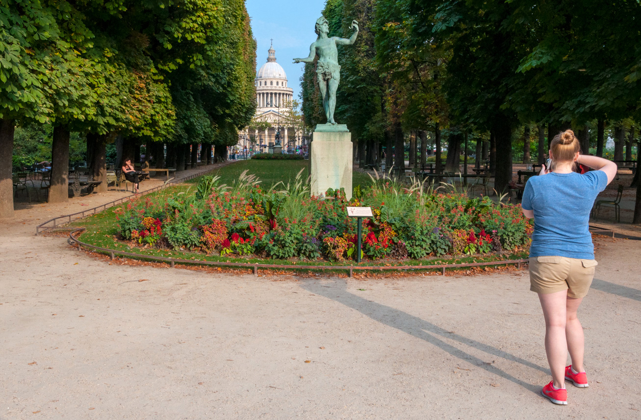 Una turista fotografía una de las estatuas de los Jardines de Luxemburgo en París.