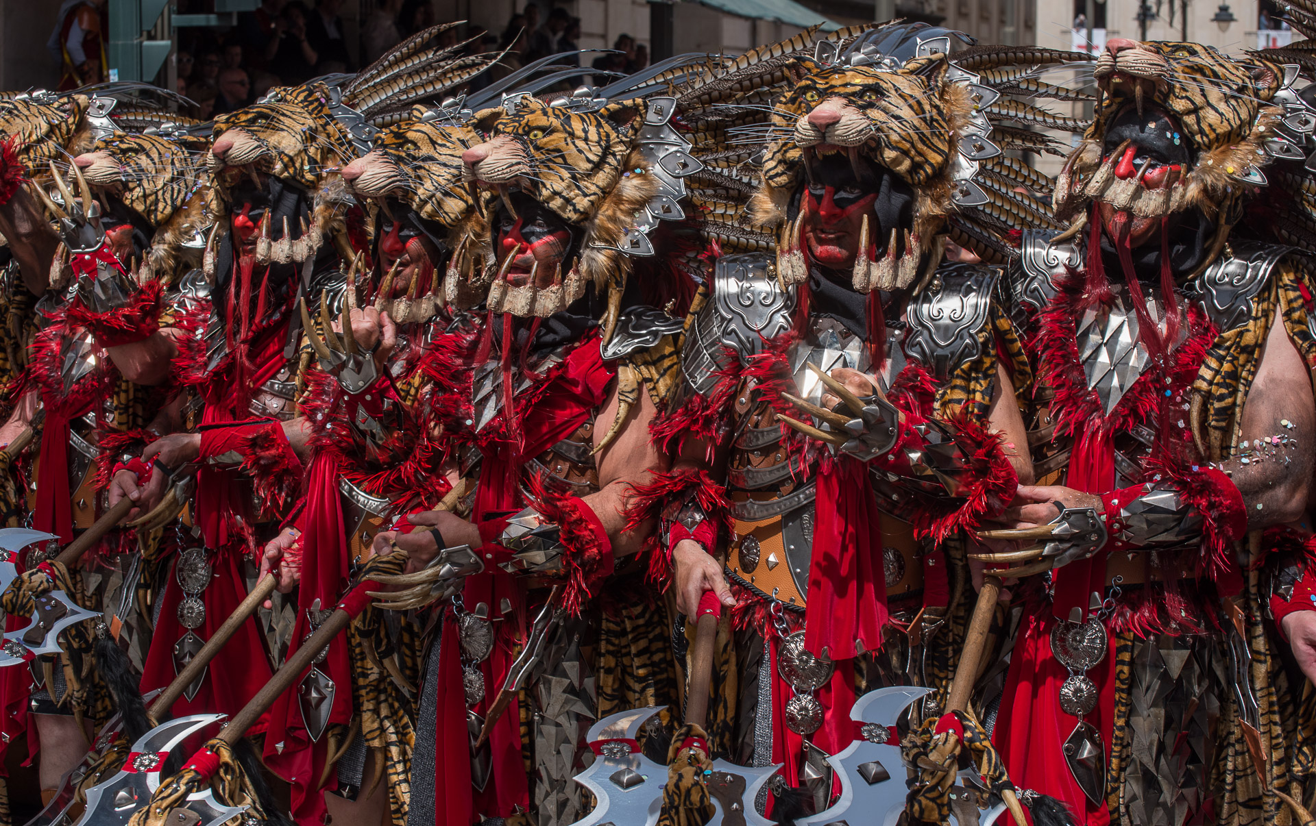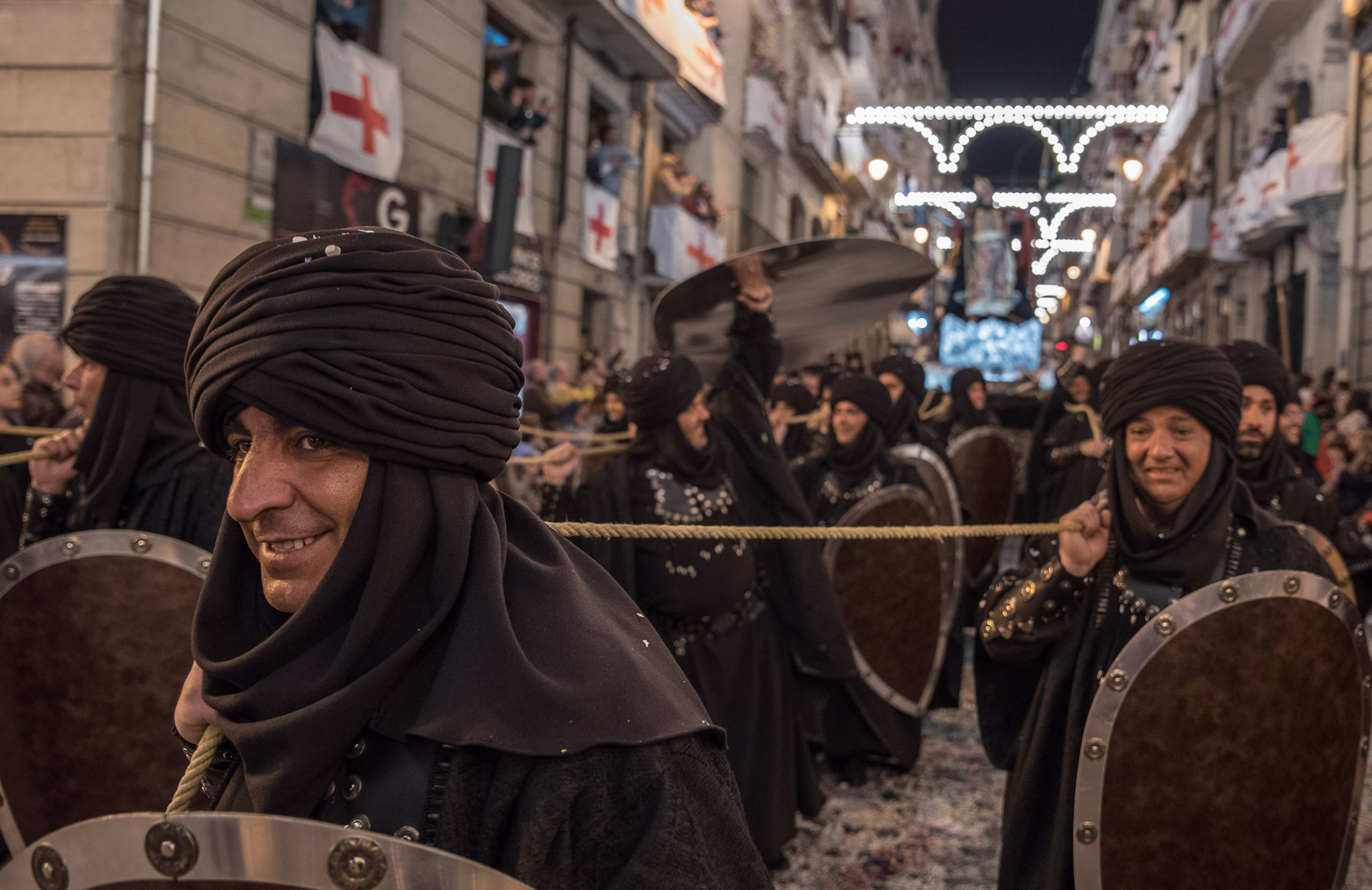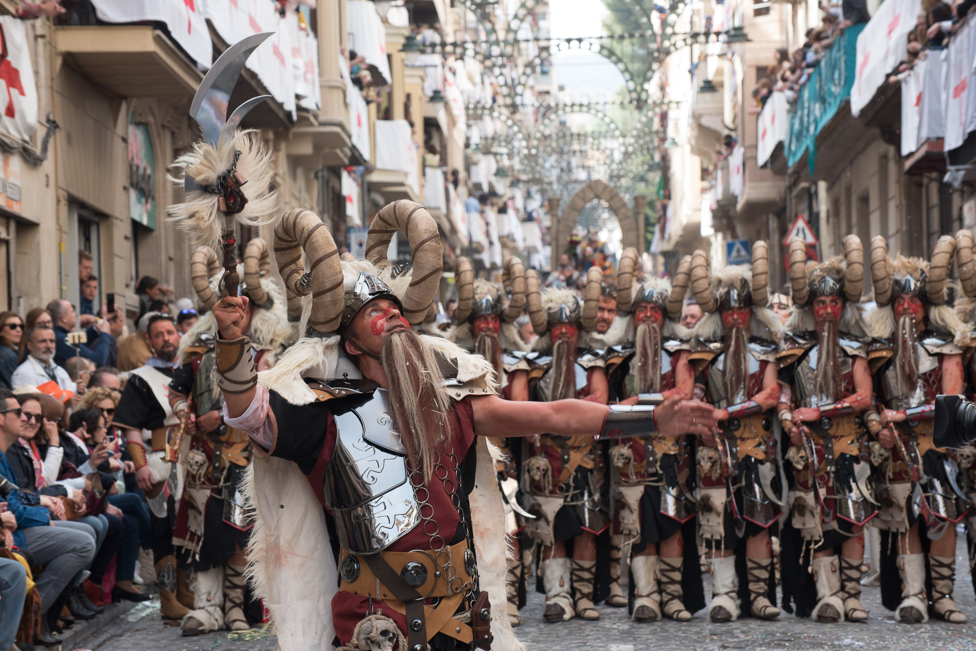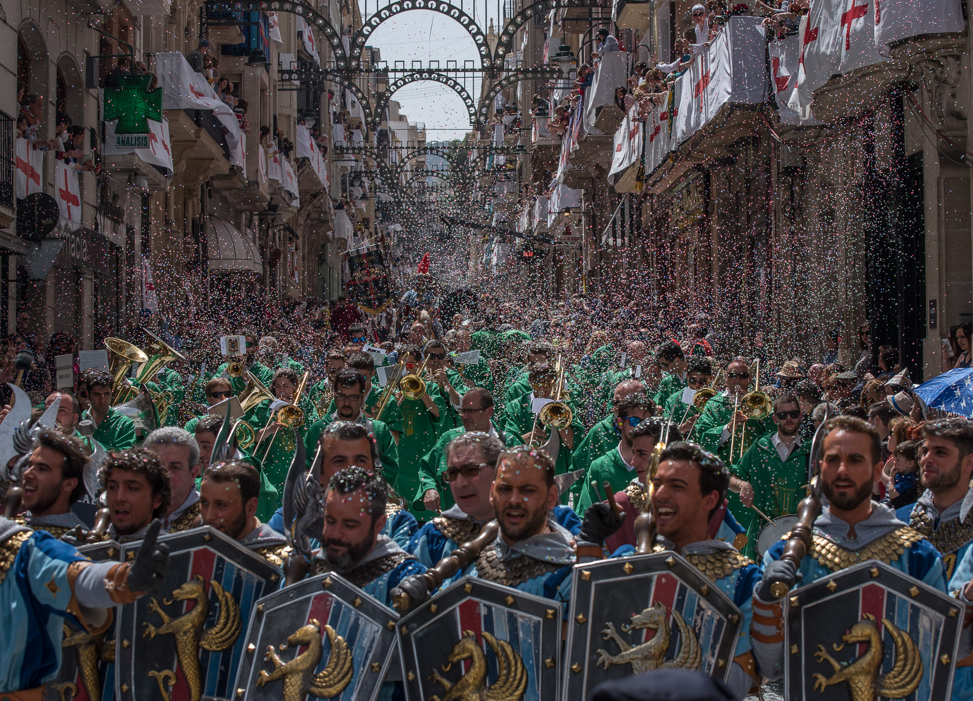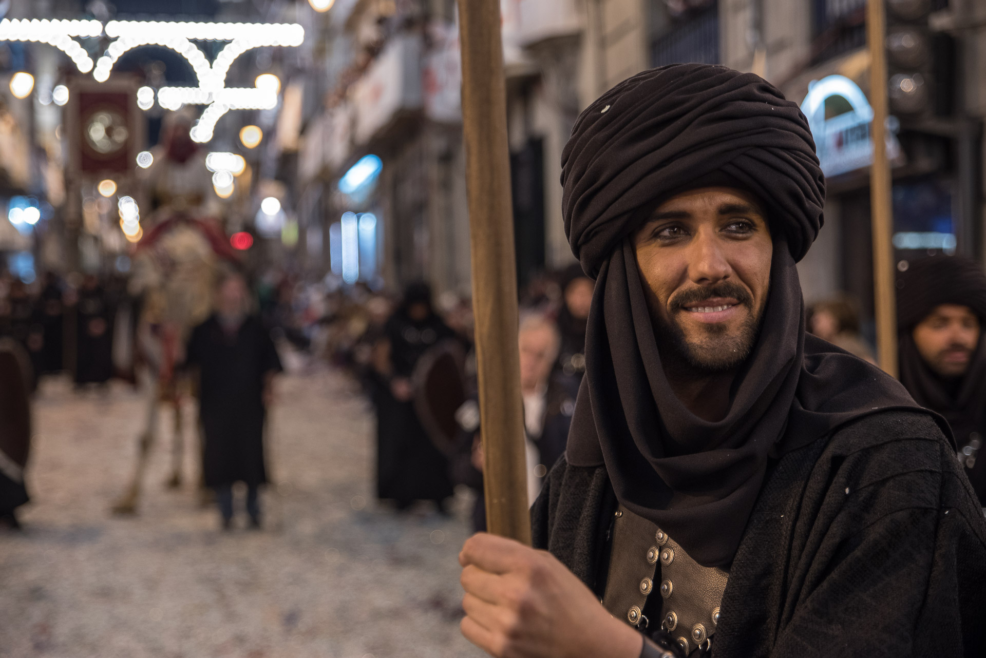 Fieros guerreros del bando cristiano que llenan la calle de color y de un aire amenazante, aunque probablemente sus trajes no habrían sido muy cómodos en una guerra de verdad.