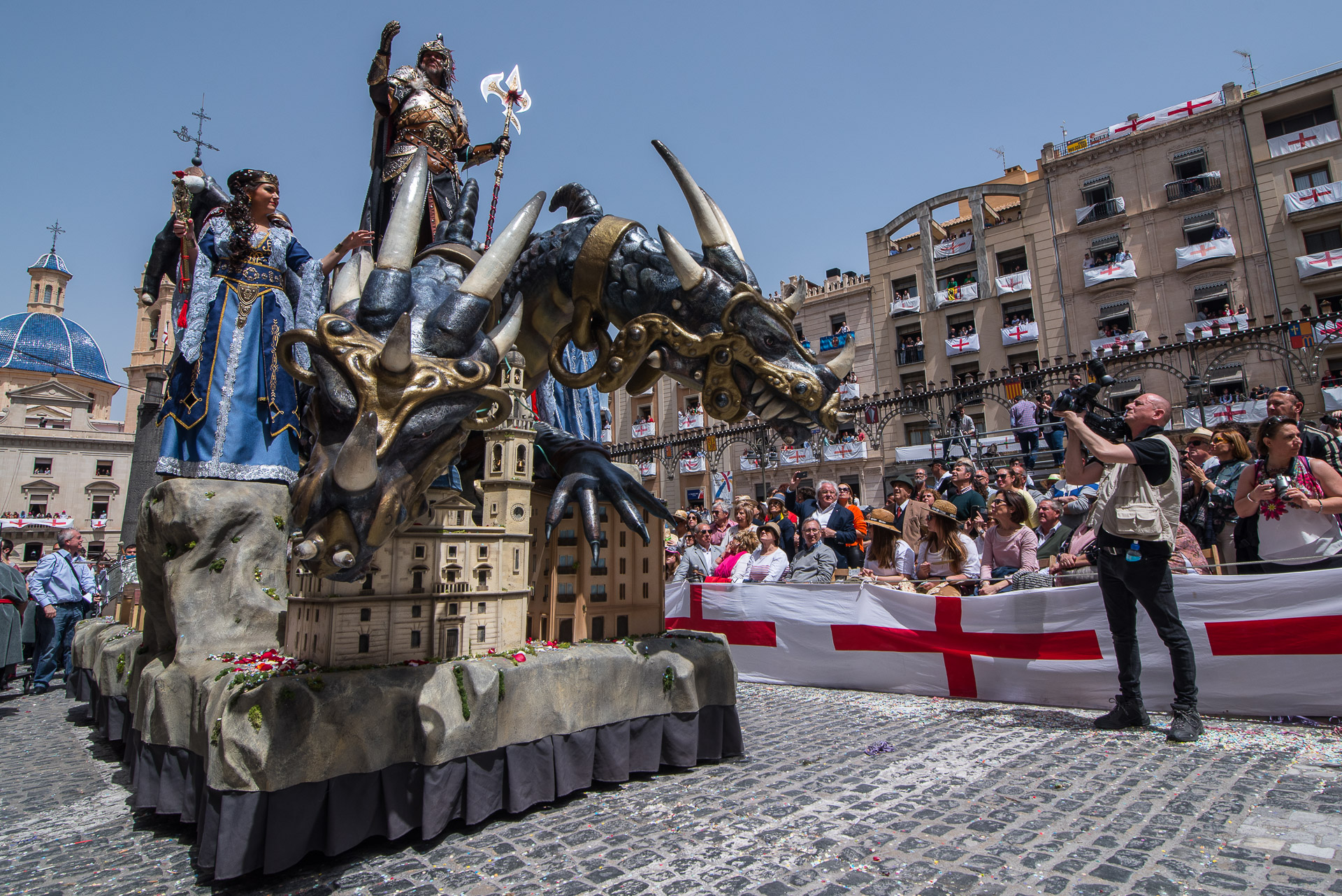 El alférez cristiano cerró el desfile de su bando subido a una espectacular carroza que representaba a un dragón de dos cabezas -hay que recordar que las fiestas son en honor de San Jorge- sobre algunos reconocibles edificios de Alcoy.