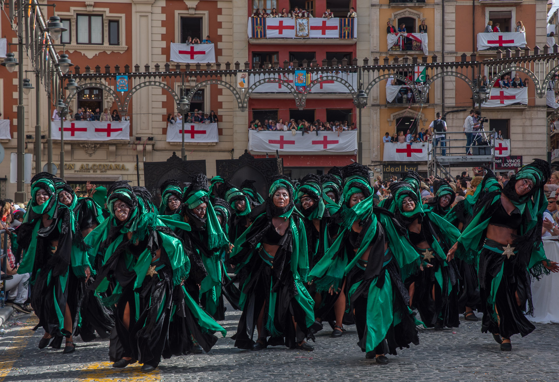Una de las espectaculares escuadras de la filà Berberiscos en su descenso por la calle San Nicolás.