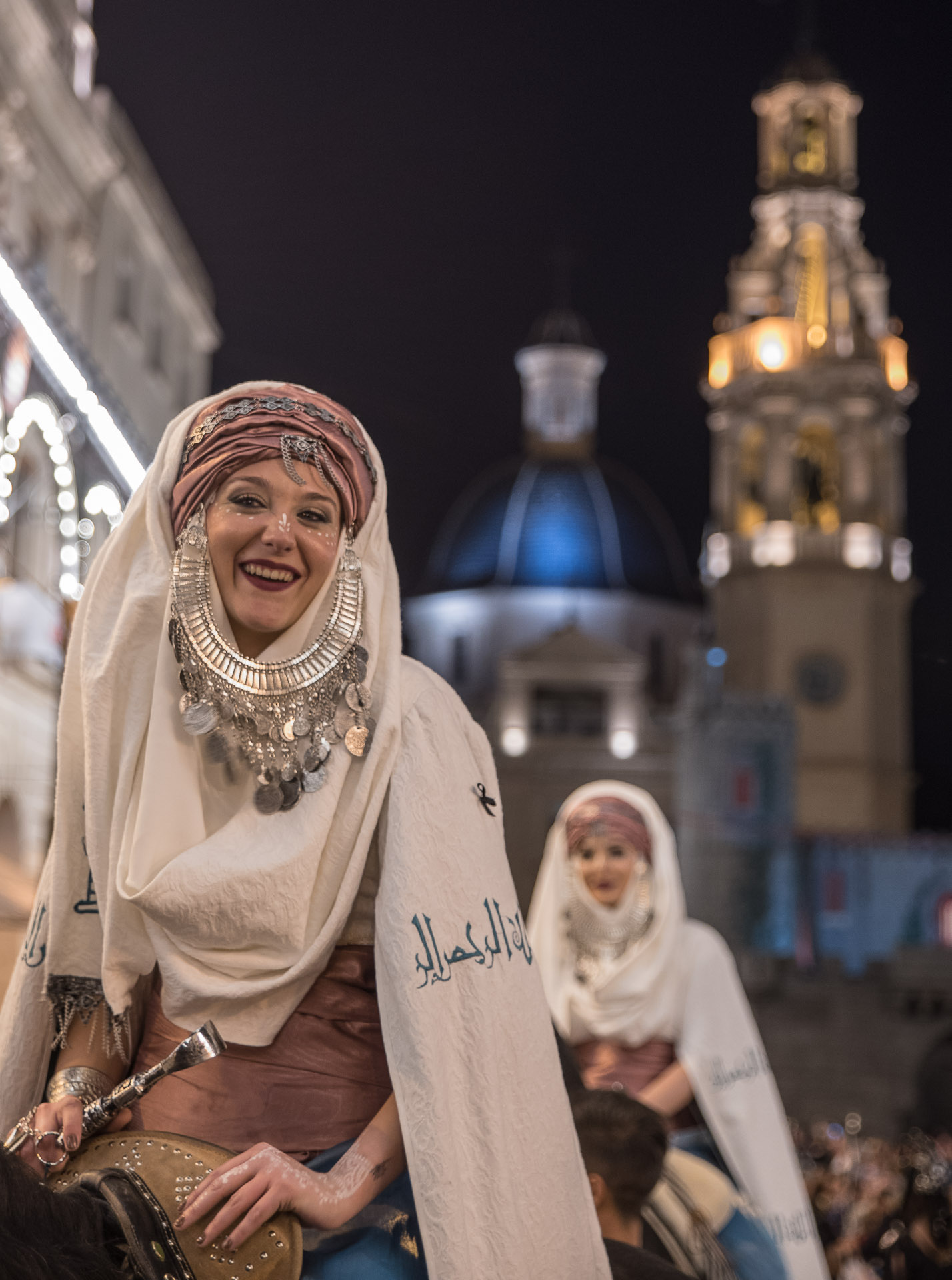 Dos mujeres desfilando y mostrando en su rostro la felicidad que para muchos alcoyanos supone el día de las entradas.