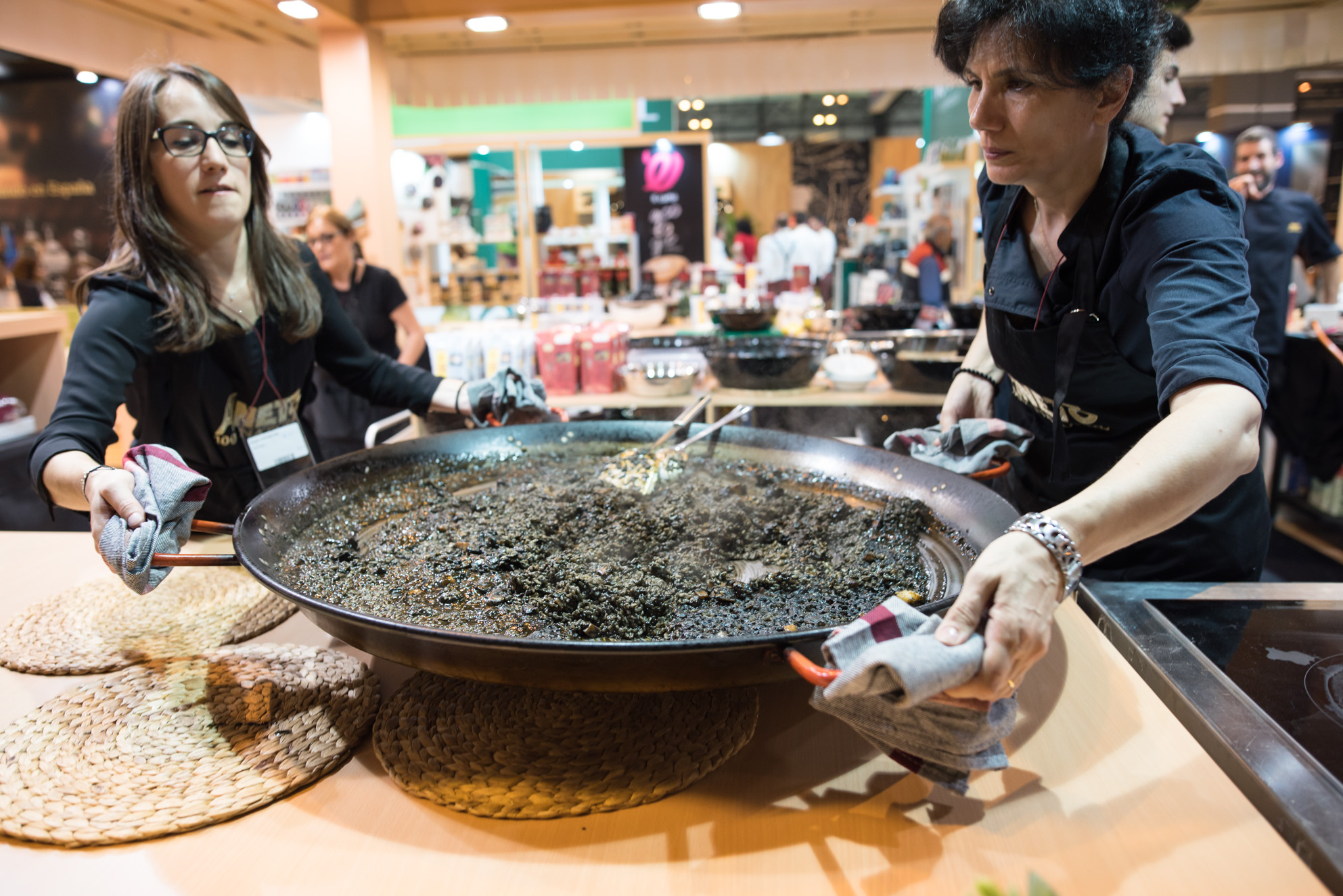 Una paella de arroz negro es levantada por dos cocineras en el Salón de Gourmets 2018 en Madrid.