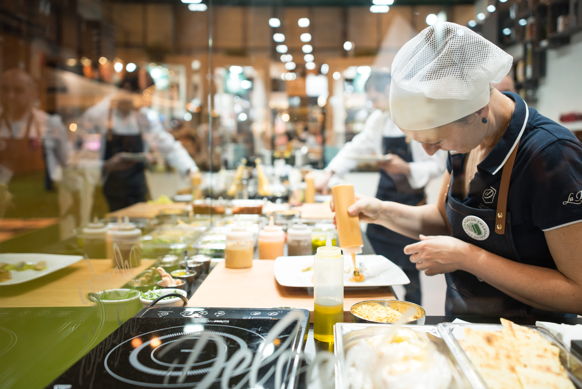 Una cocinera se esmera en una de las demostraciones culinarias en el Salón de Gourmets 2018 en Madrid.