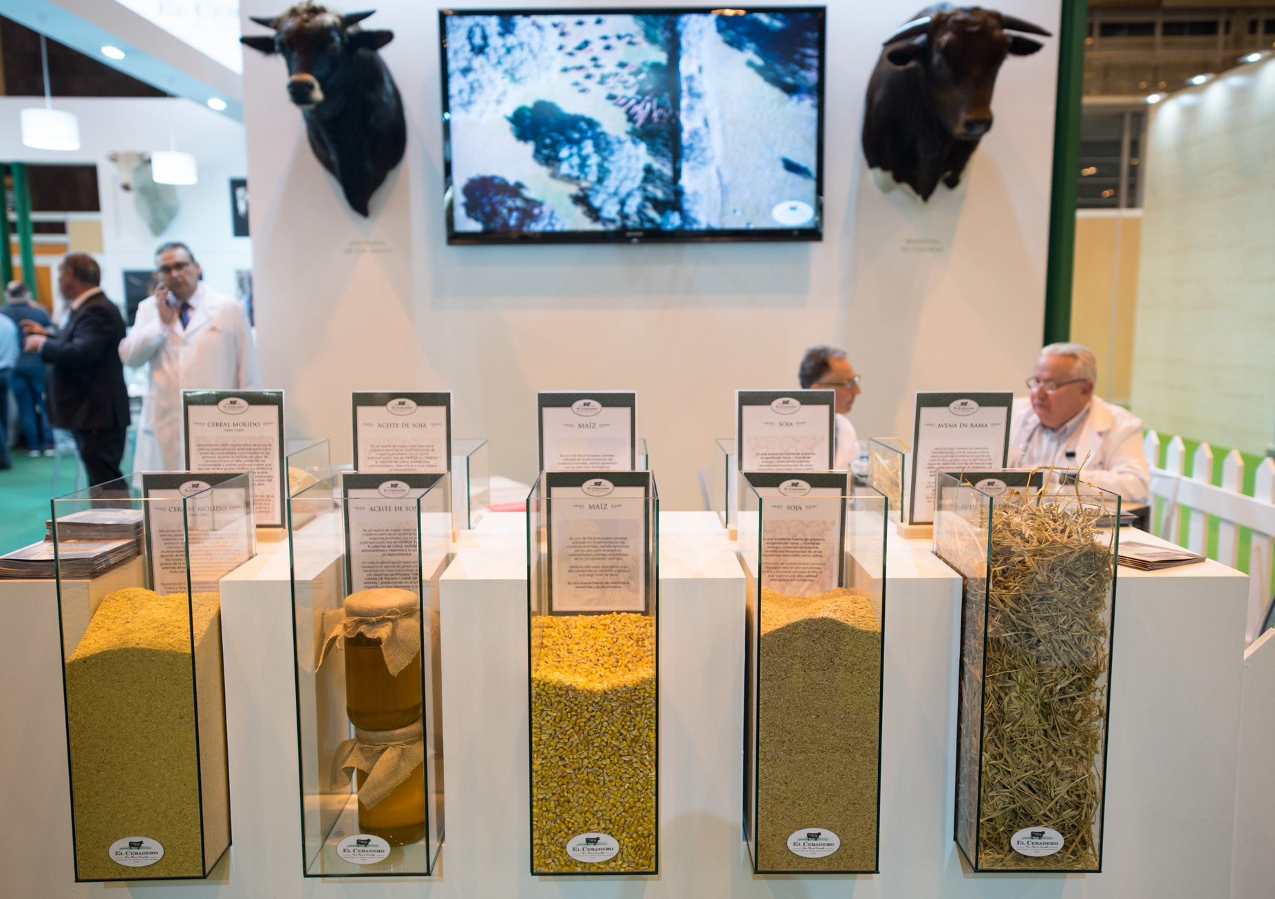 Un stand muestra los diferentes cereales que se utilizan para alimentar a las vacas asturianas.