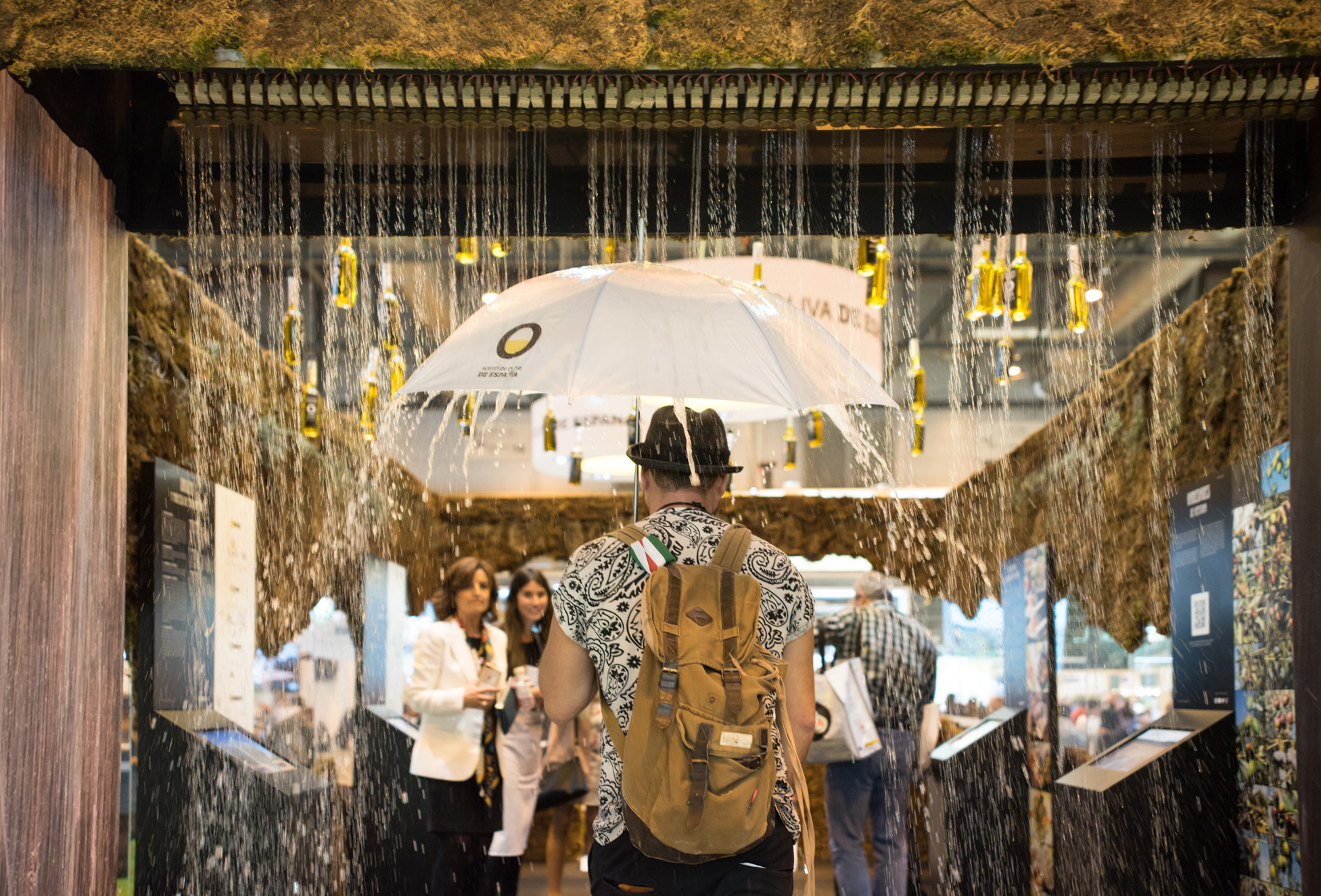 Tener que pasar bajo una cascada con un paraguas, para poder probar un surtido de aceites, no deja de ser sorprendente.