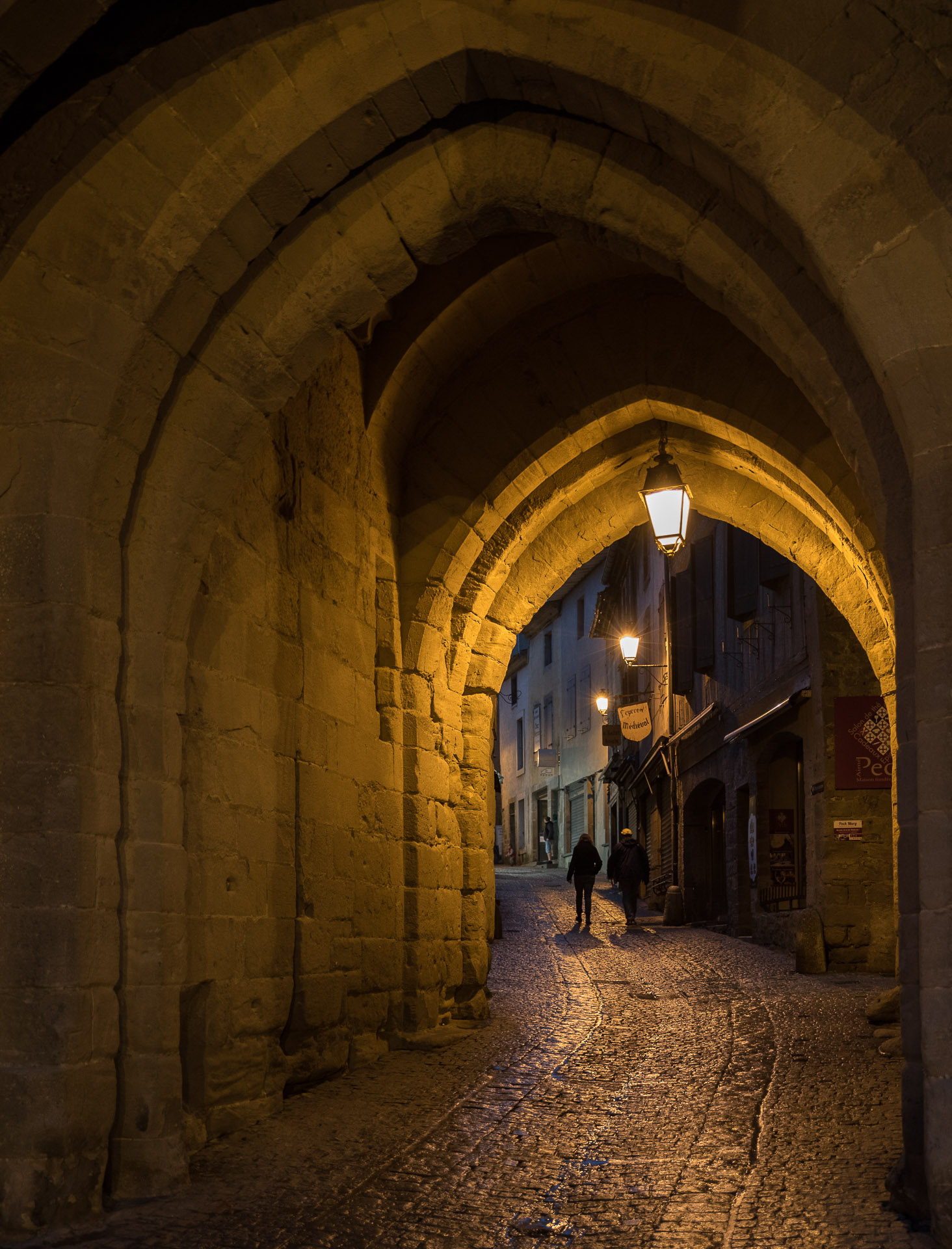 El paso bajo la Puerta de Narbona, ya con las luces de la noche.