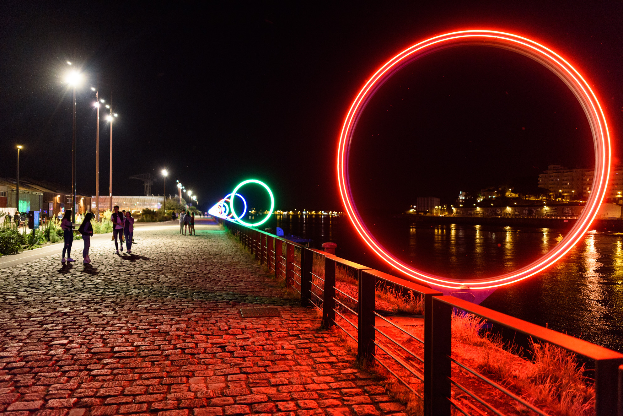 Los círculos luminosos de la Isla de Nantes se iluminan durante las horas de noche dejando un rastro de colores que hacen aún más bonito e interesante el paseo nocturno por la zona.
