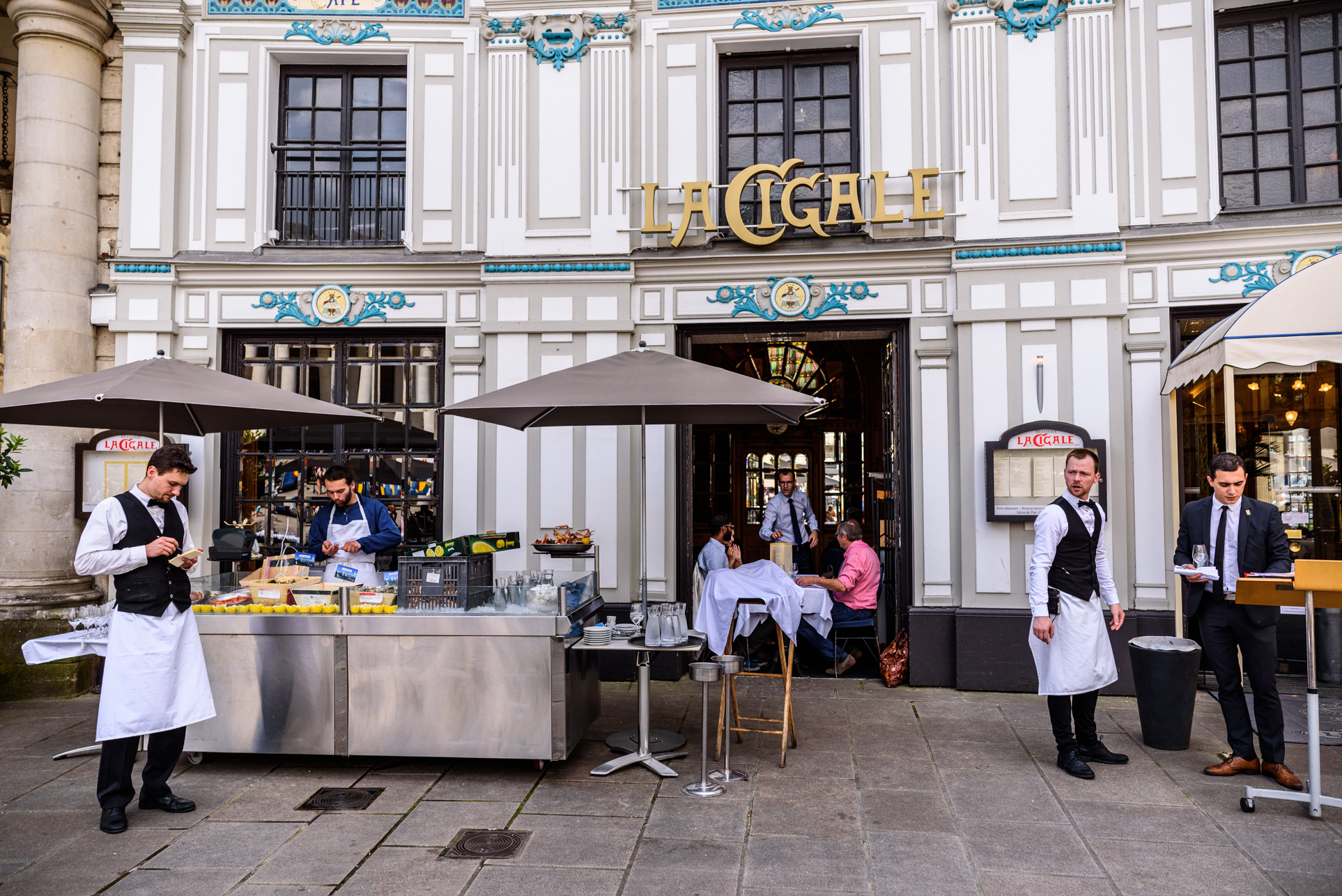 Fachada y entrada del restaurante La Cigale, buque insignia de la flota de restaurantes de la ciudad. Es, con diferencia, al que su fama más precede y su servicio y calidad así lo demuestra.