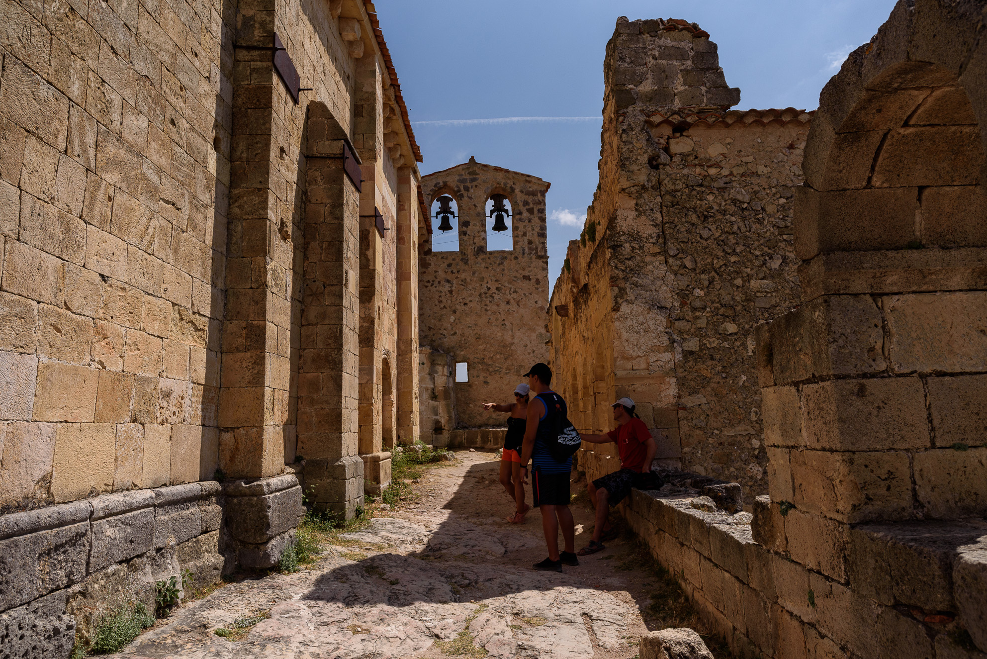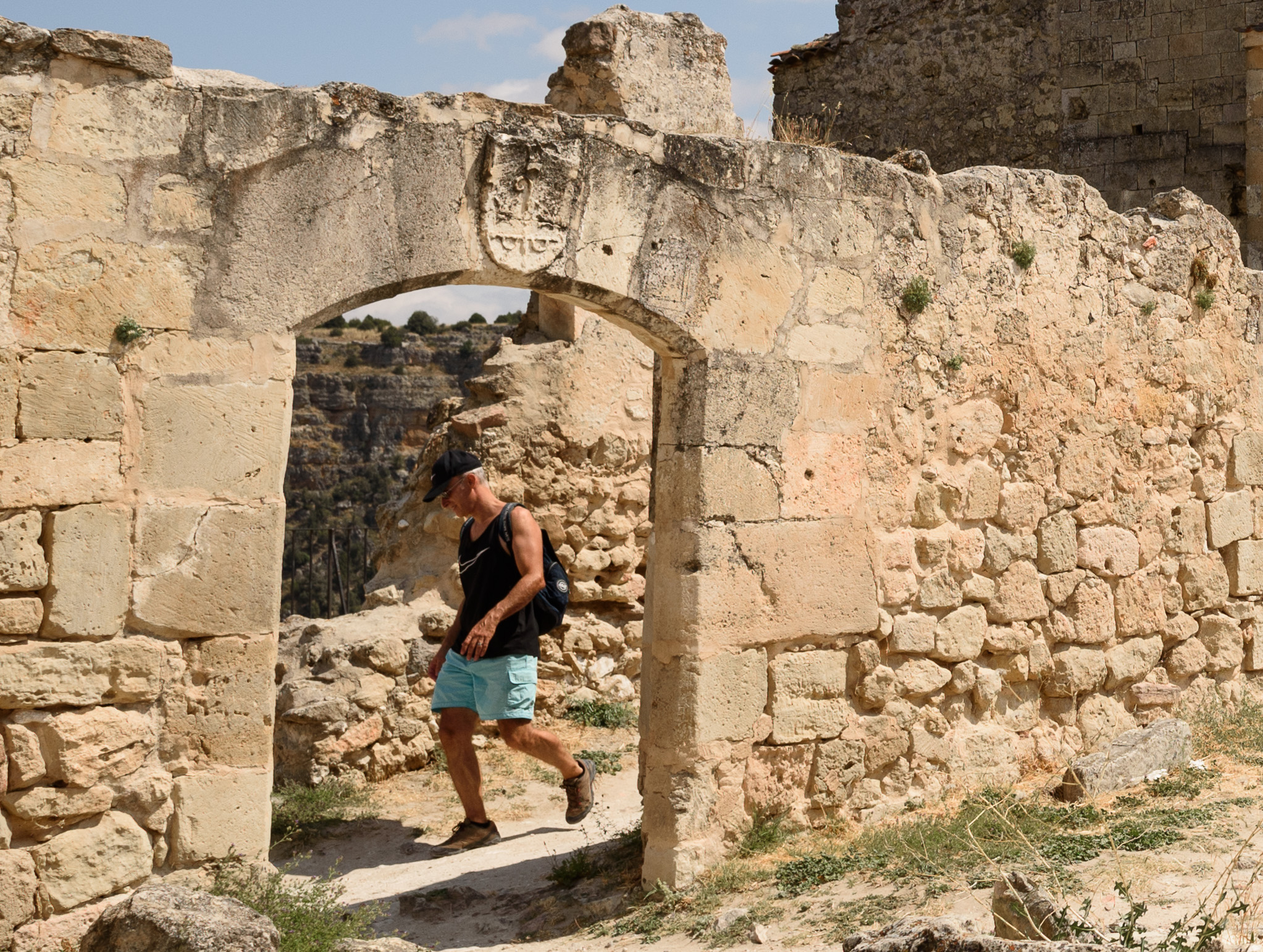 Una persona camina entre las ruinas del antiguo monasterio sobre las Hoces del Duratón.