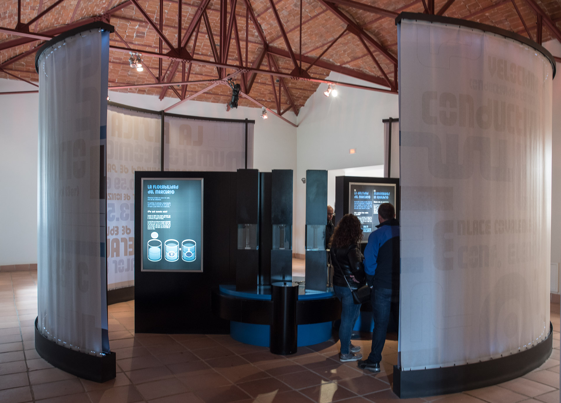 Una visitante del Museo del Mercurio contempla grandes piezas de cinabrio.