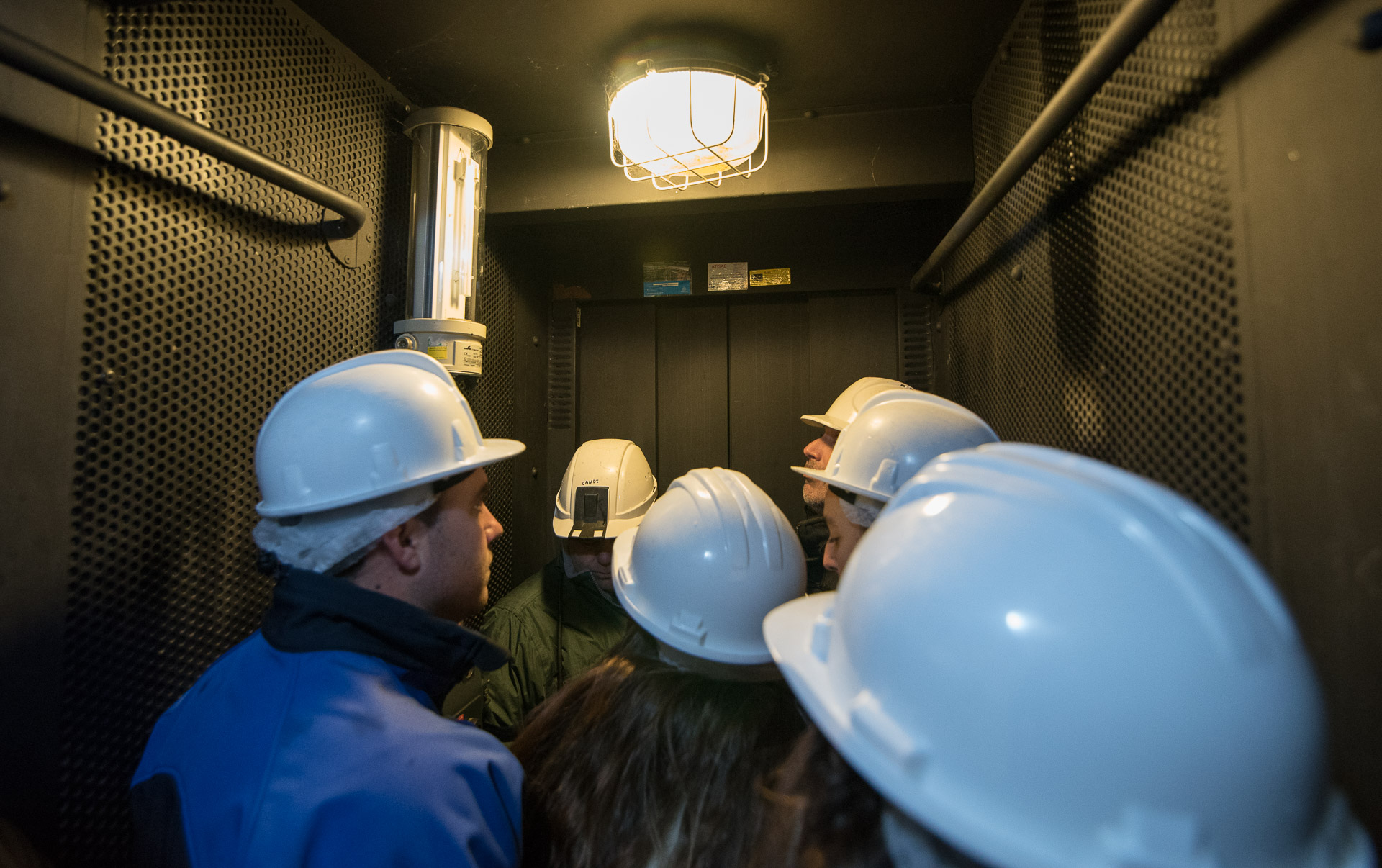 Un visitante observa viejos elementos de la maquinaria de la mina.