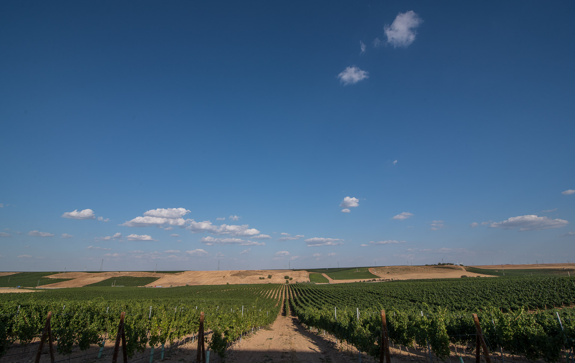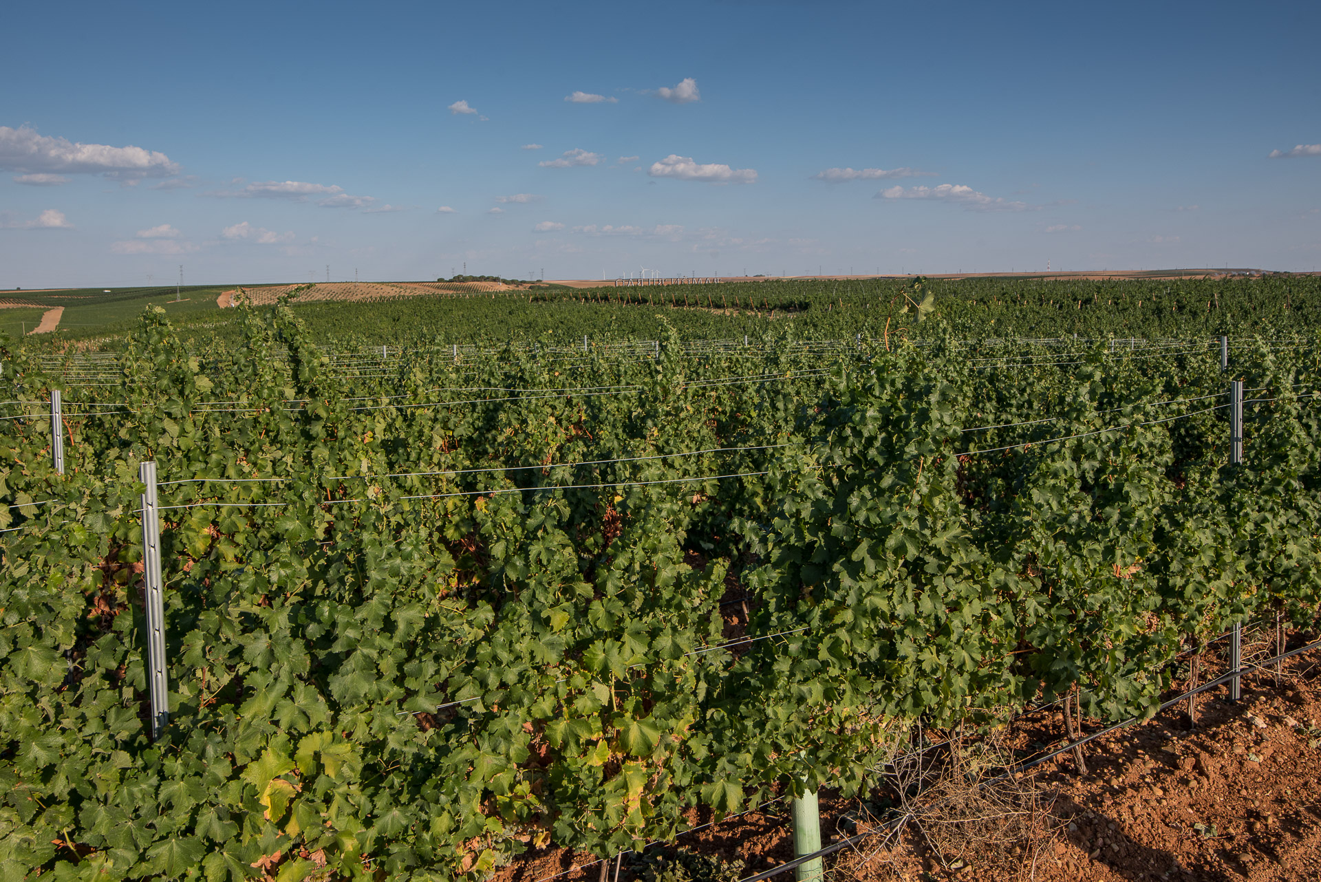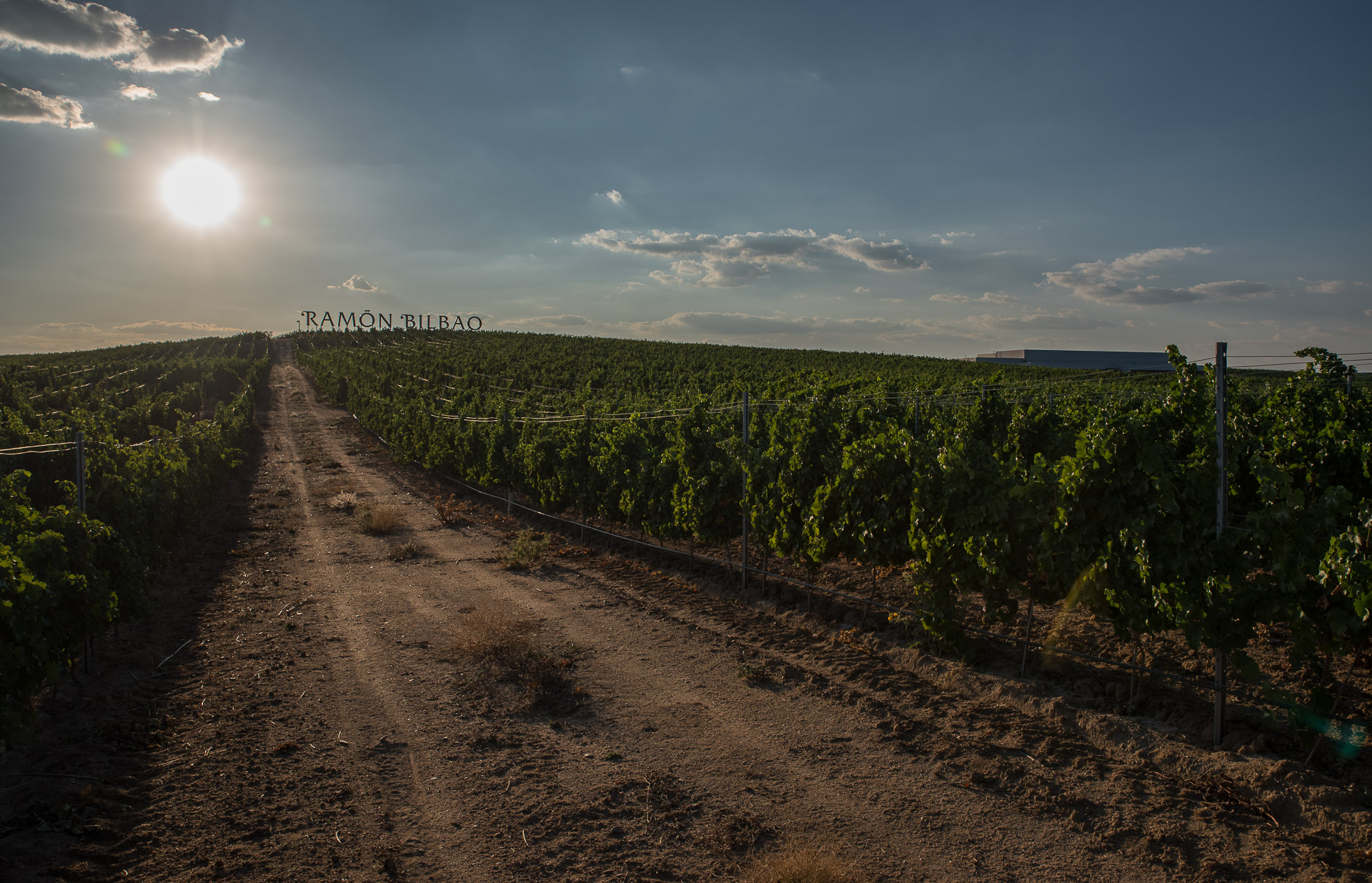 Una vista del viñedo y, al fondo a la derecha, el edificio de la bodega Ramón Bilbao en Rueda.
