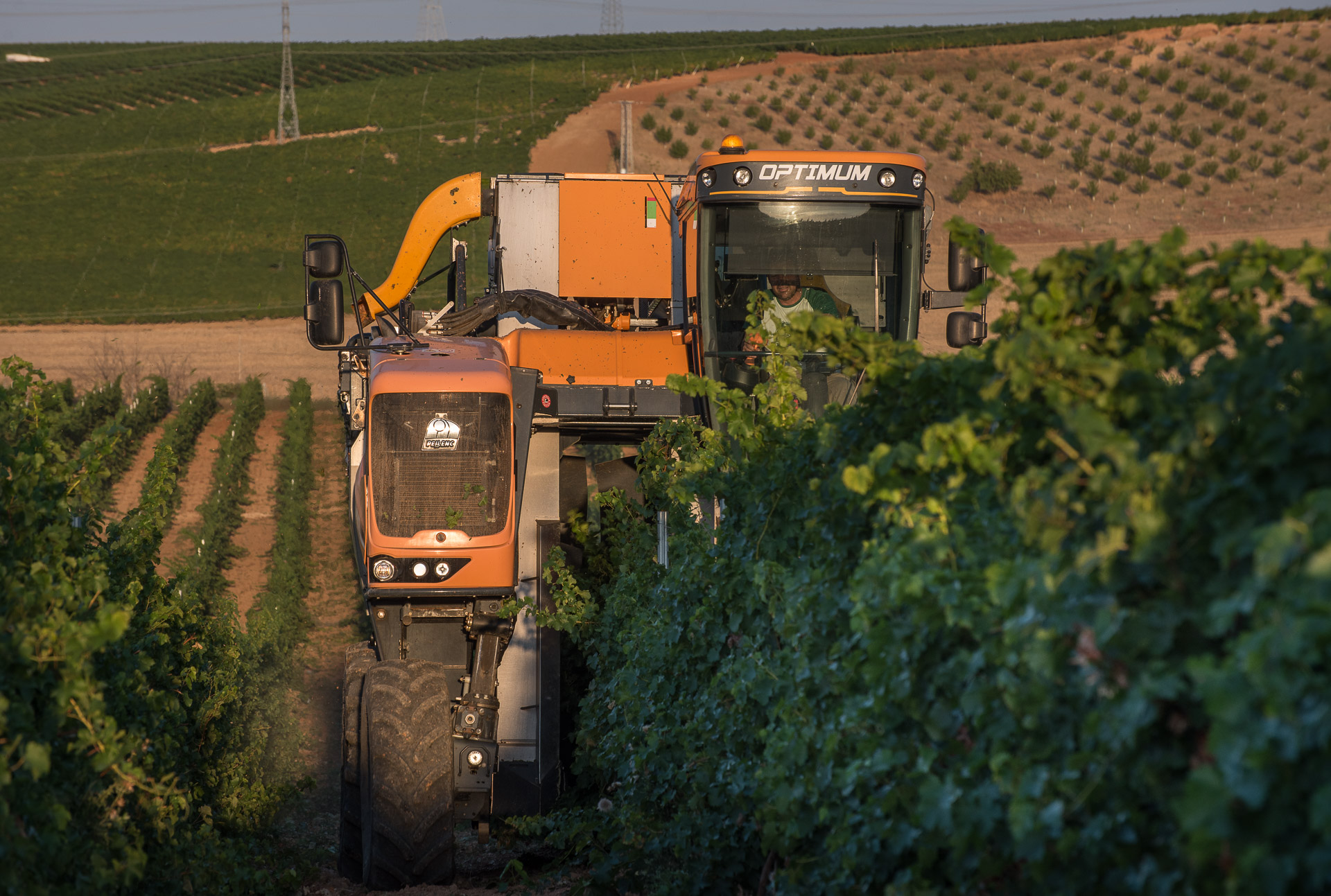 Las enormes máquinas pasan por encima de la fila de vides, hacen vibrar la planta y succionan las uvas, que son extraídas de los racimos con una limpieza increíble.