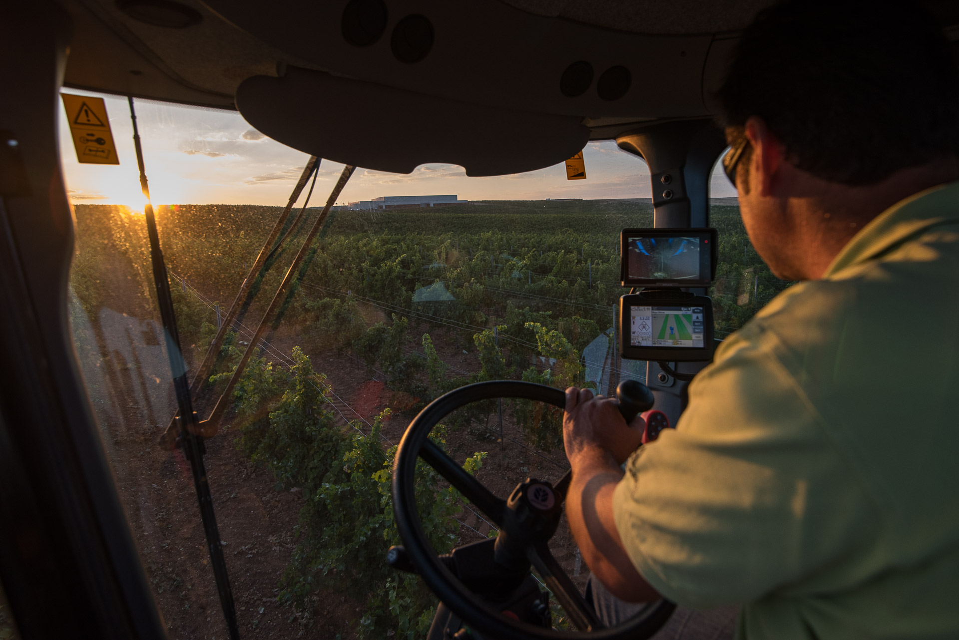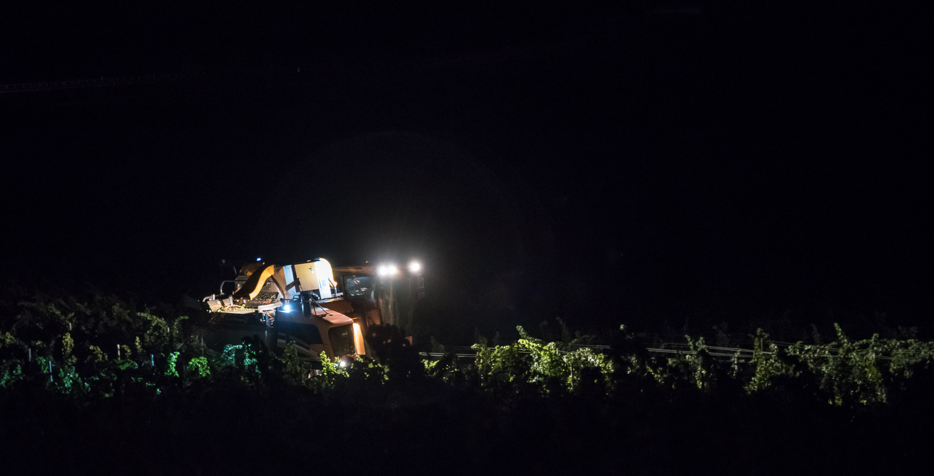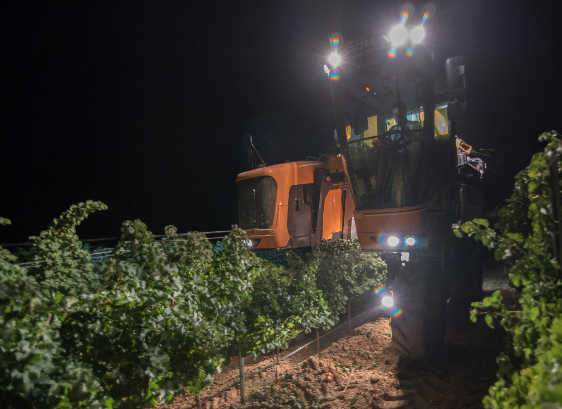 Un operario experto maneja la vendimiadora. Lo hará durante toda la noche.