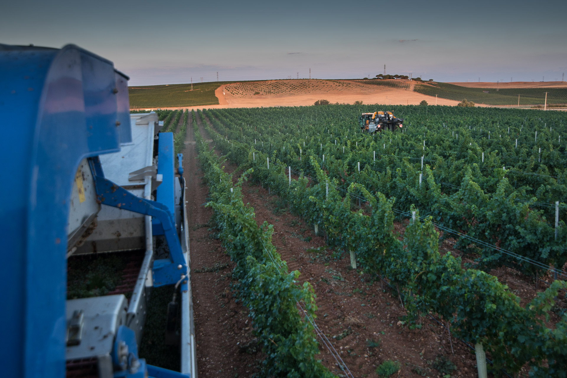 Las dos grandes vendimiadoras trabajan al mismo tiempo, aunque a una distancia prudencial una de otra.
