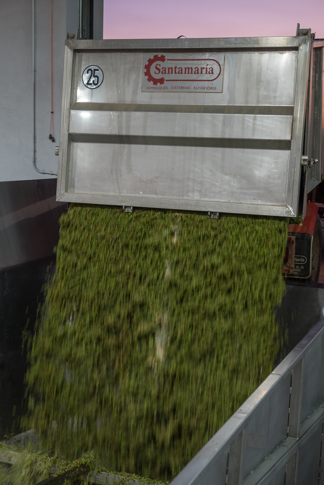 Una vez vendimiada la uva es vertida por toneladas en una gran tolva.