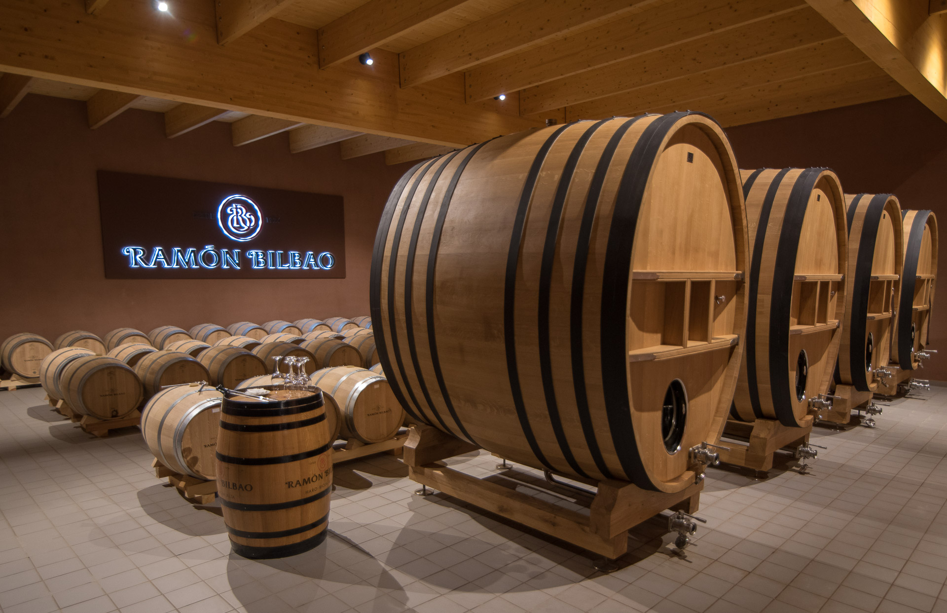 La pequeña sala de barricas de la bodega Ramón Bilbao en Rueda.