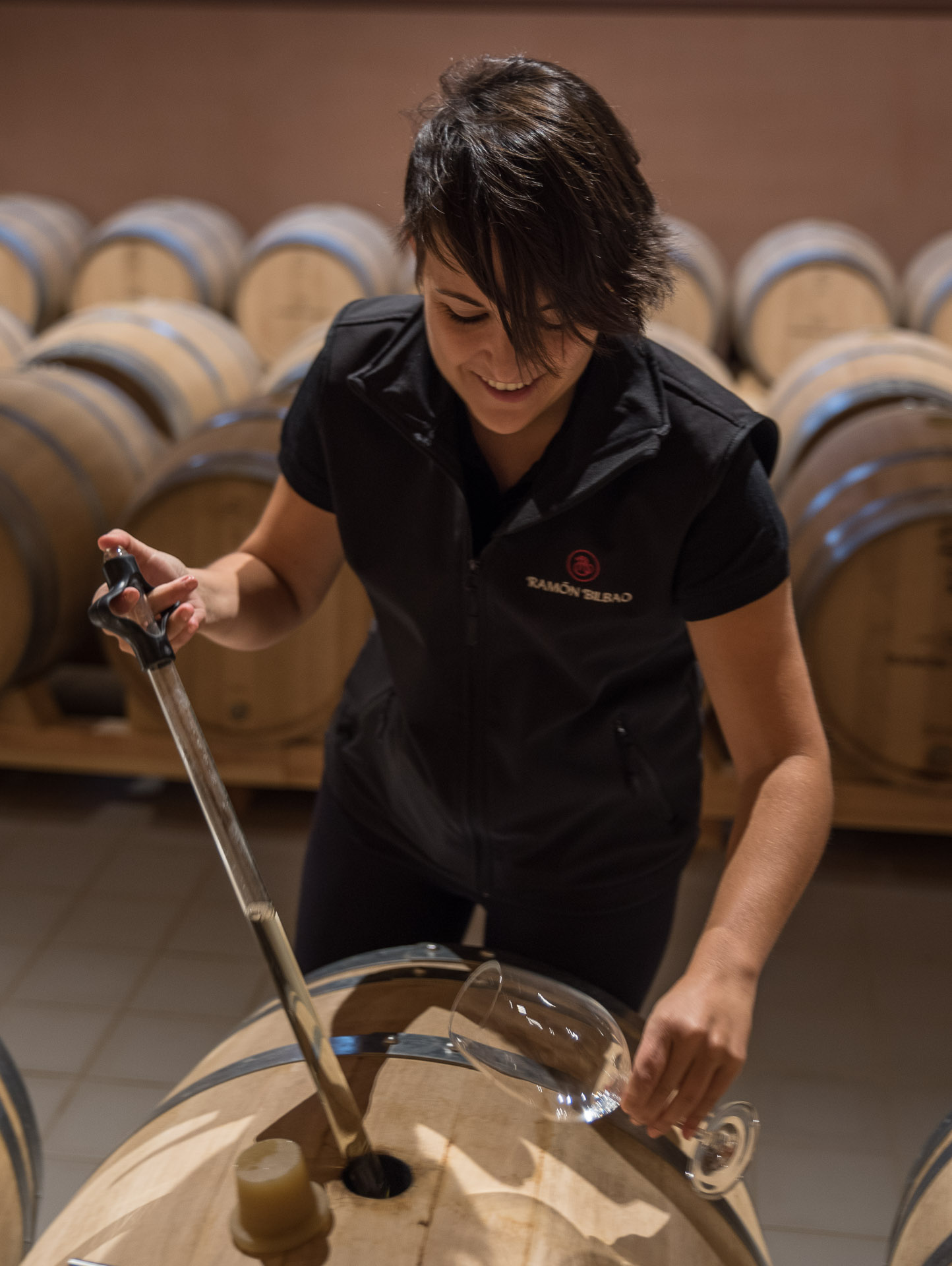 La enóloga Sara Bañuelos muestra como evoluciona el mismo vino en diferentes barricas.