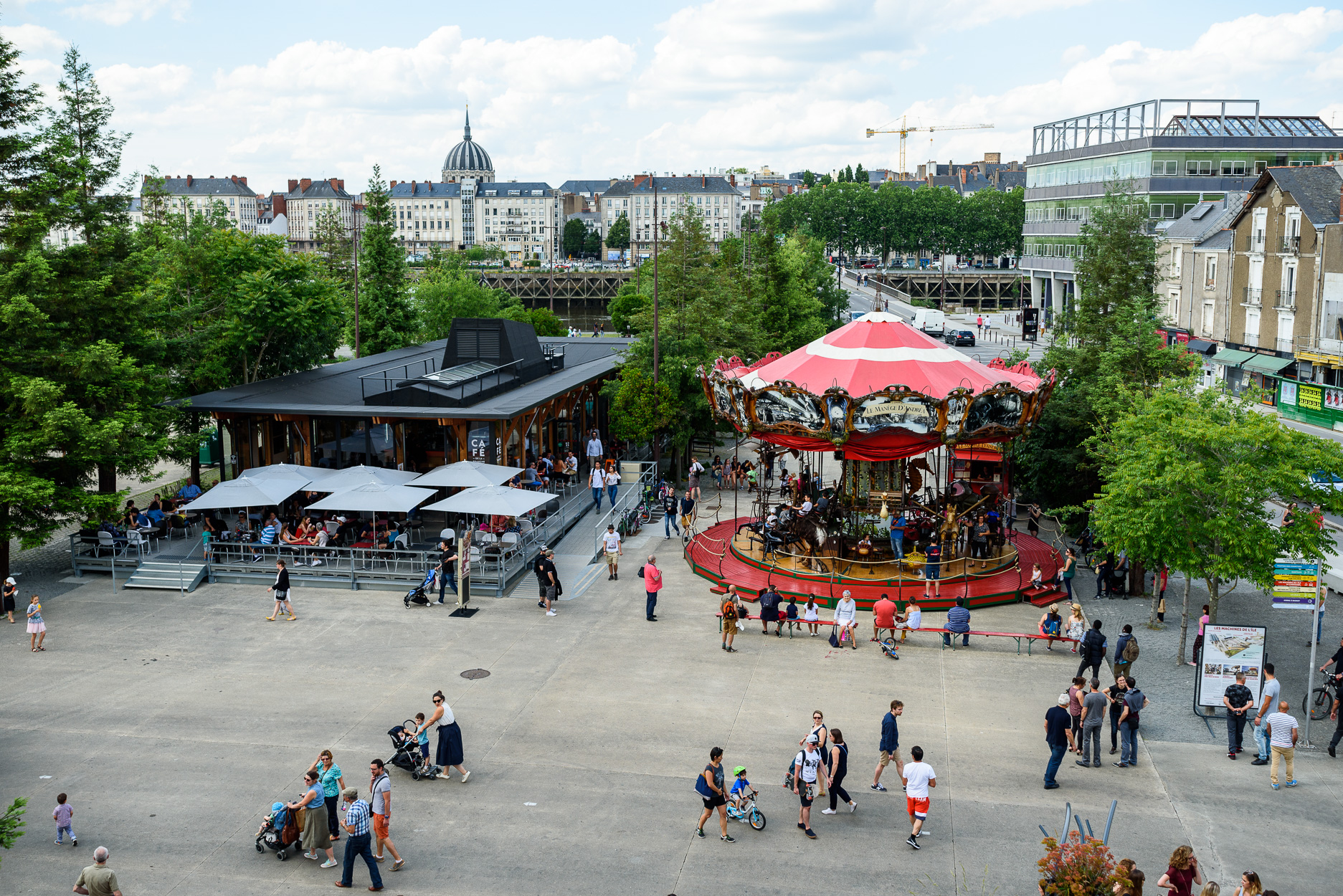 Una panorámica del nuevo barrio de La Isla de Nantes, junto al carrusel gigante de la compañía Les machines de l\'îlle.