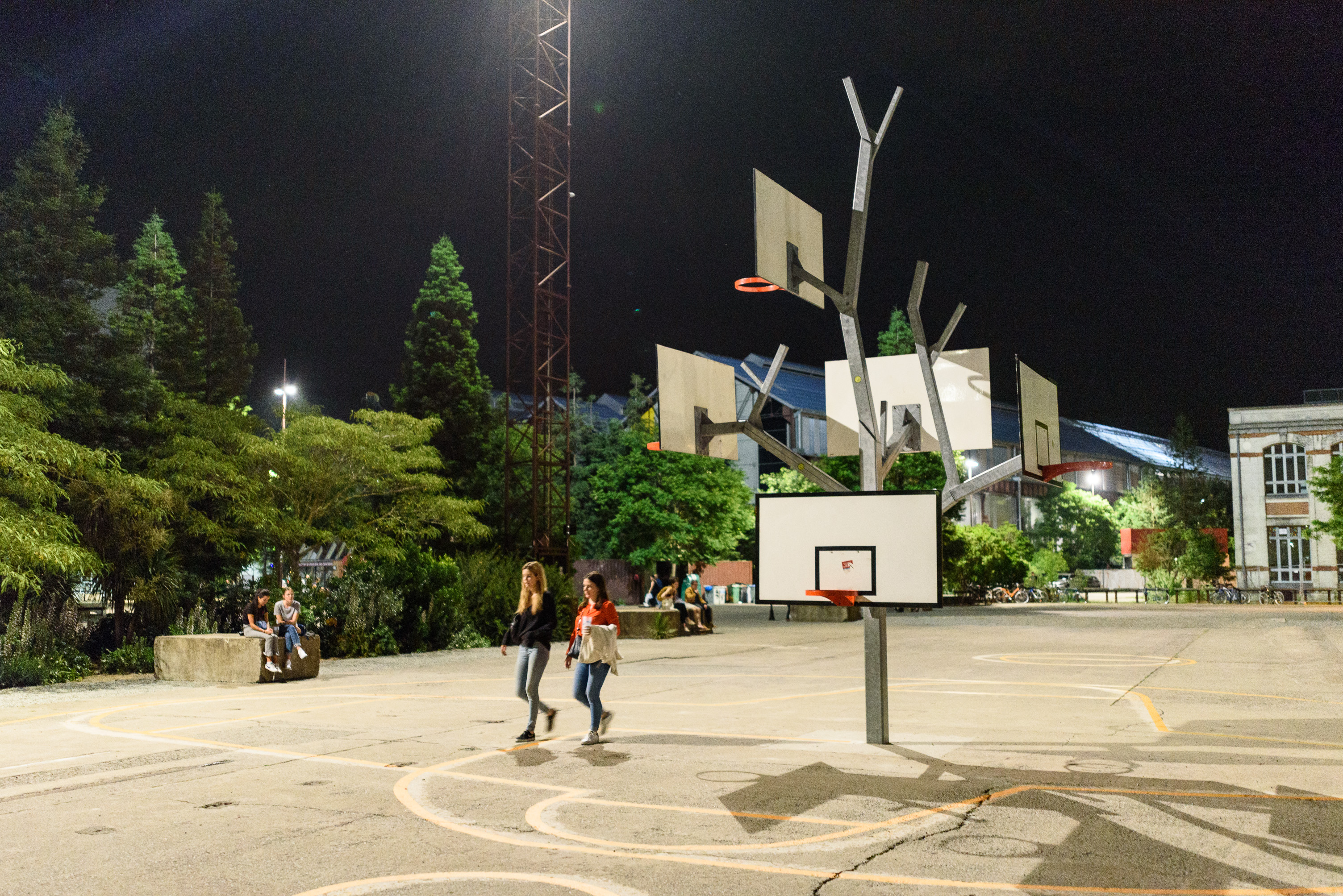 El árbol de las cestas, con aros a distintos niveles y alturas.