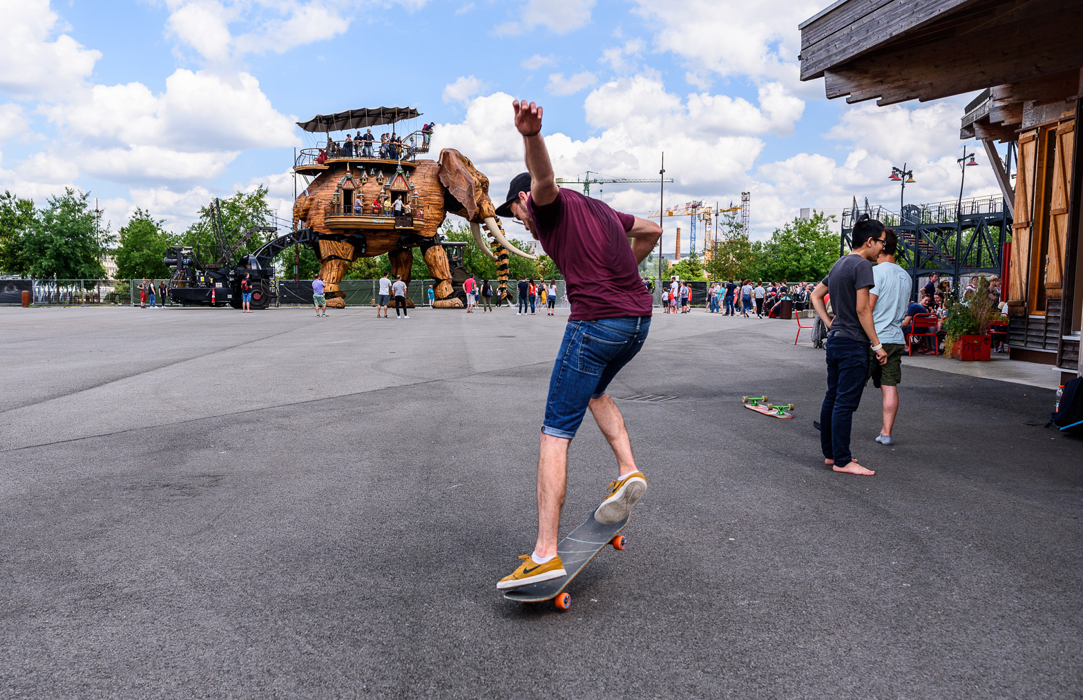 Un adolescente practica con su tabla de patinar mientras el gran elefante de Les Machines pasea por el barrio de la Isla de Nantes.