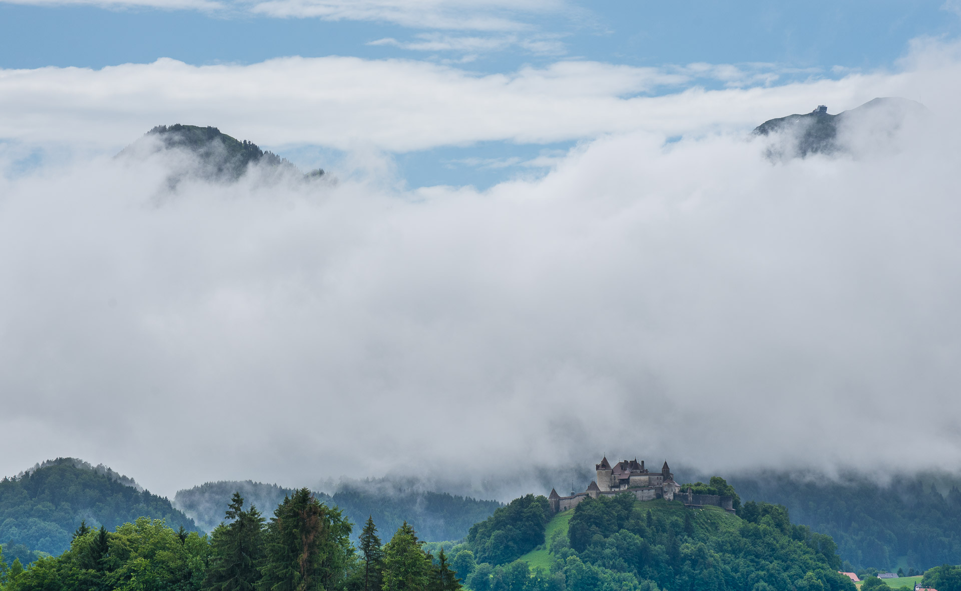 El castillo de Gruyères, en Suiza, entre las nubes y con las montañas prealpinas de fondo.