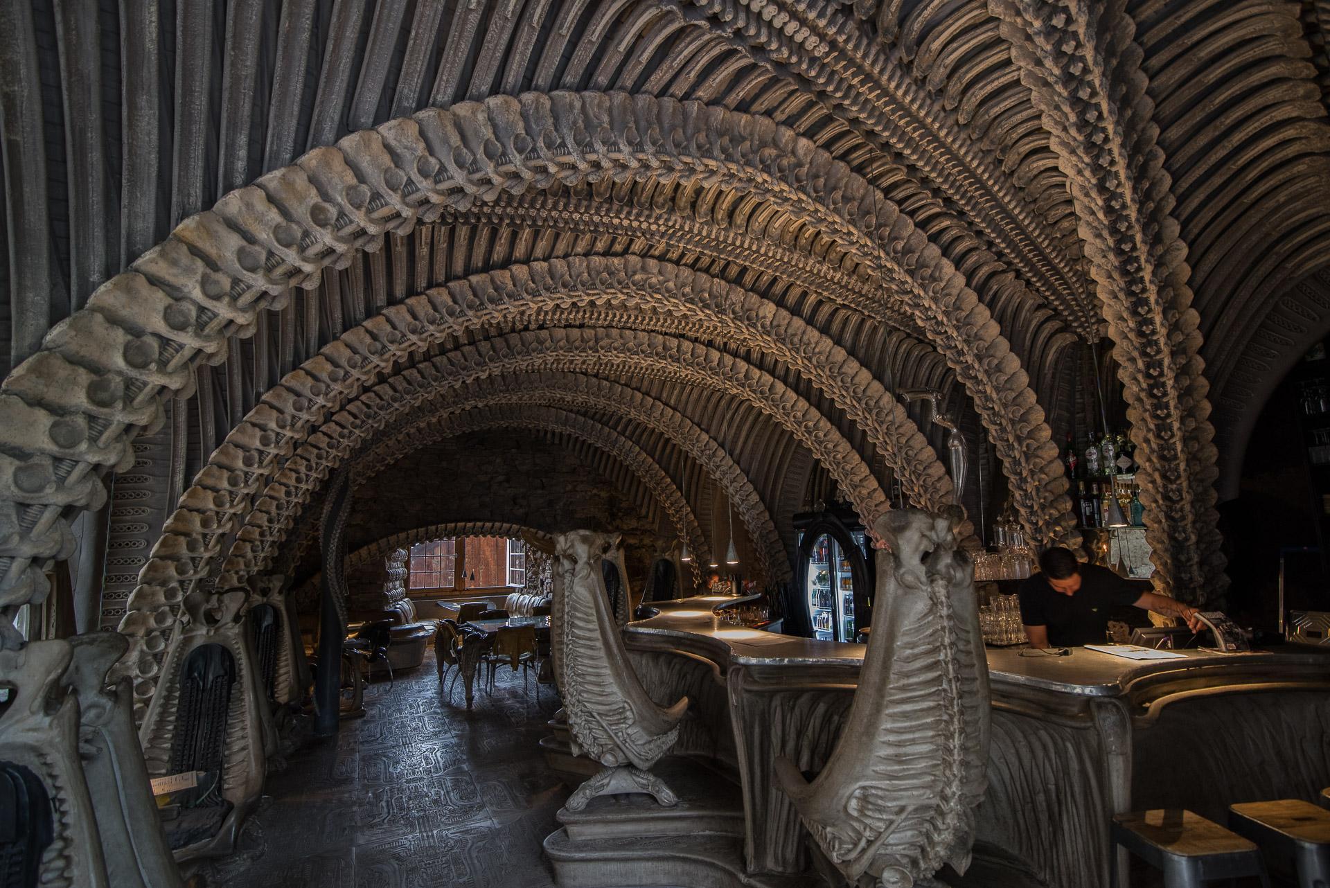 Un bar frente al museo está decorado de arriba a abajo con la estética sorprendente e inquietante propia de HR Giger.