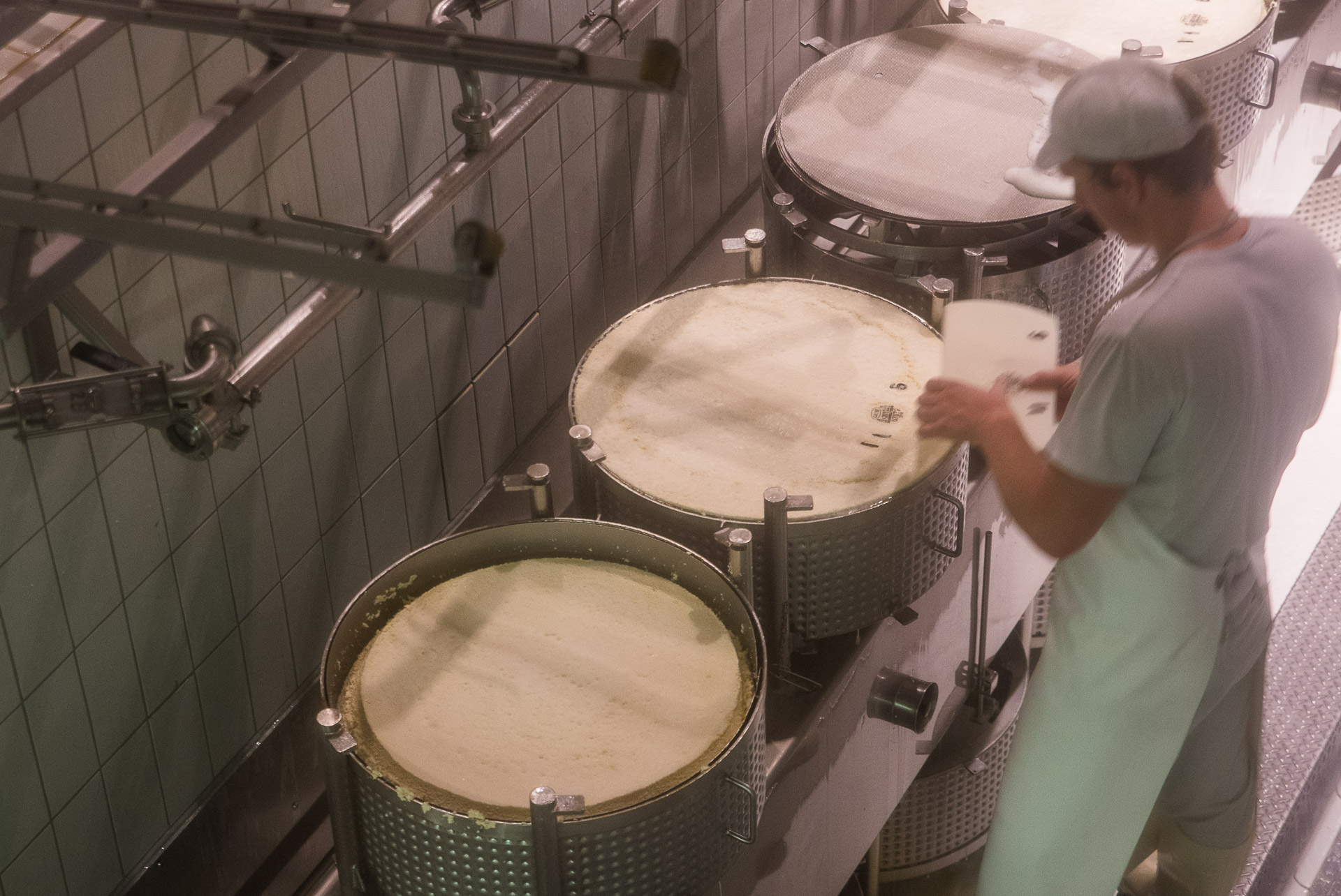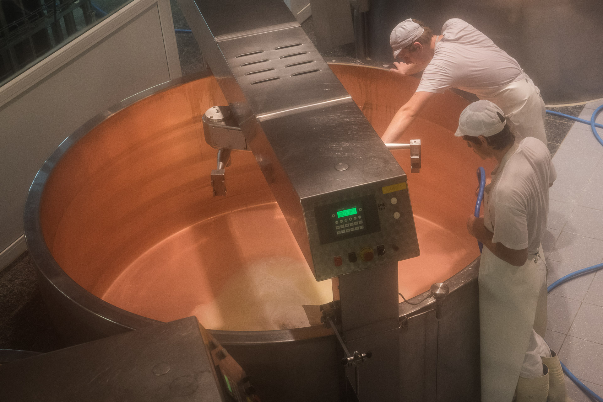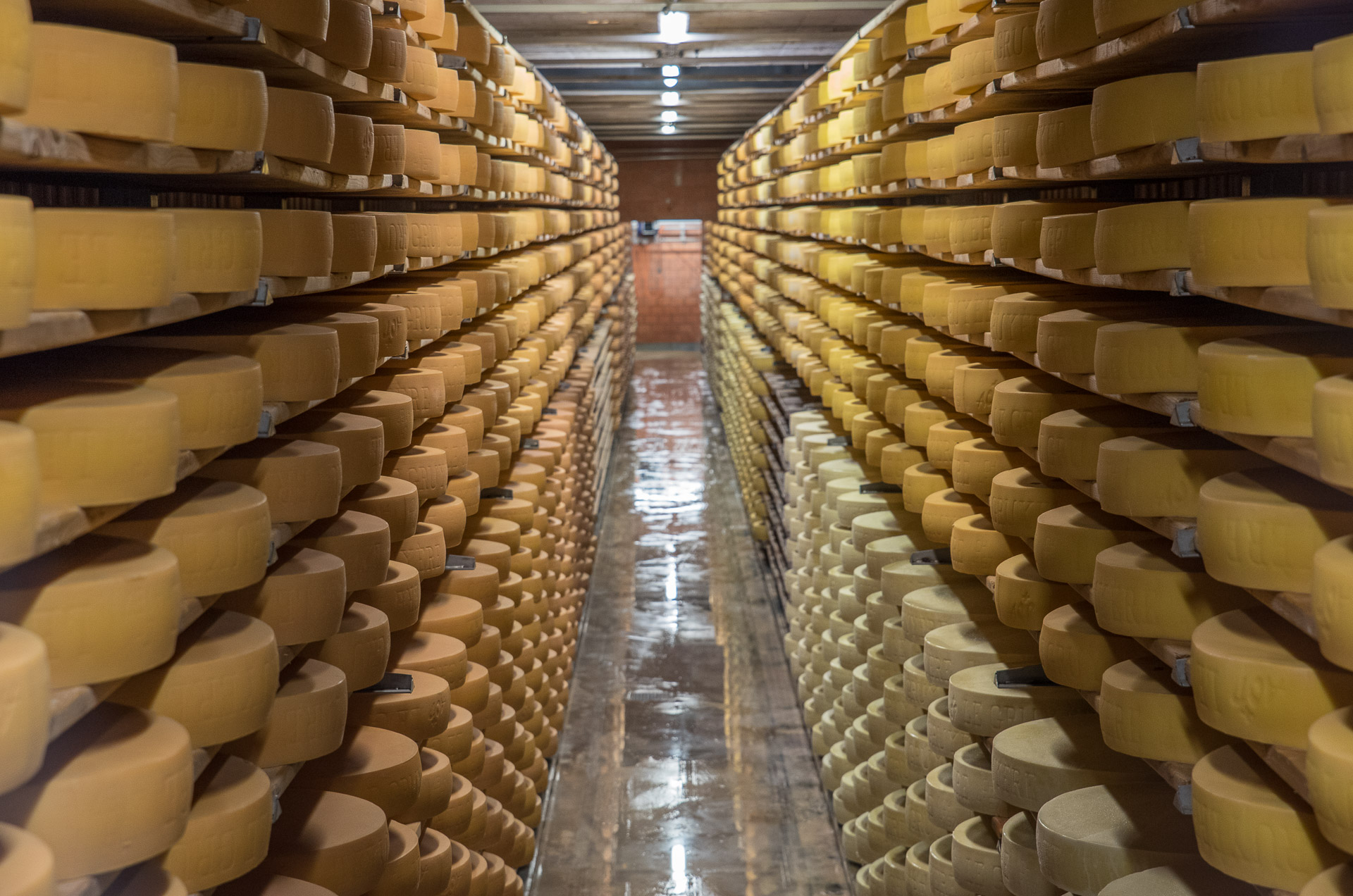 Decenas y decenas de quesos de gruyer madurando en \'La Maison du Gruyere\'.