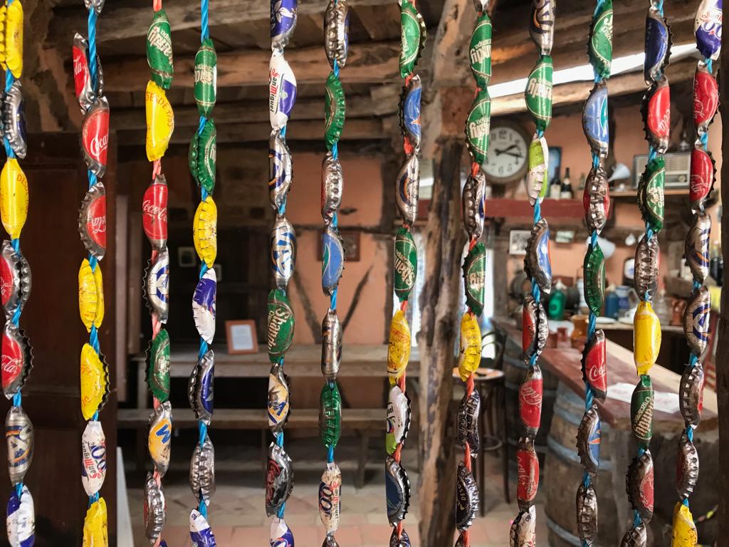 La entrada a la taberna está decorada con diferentes chapas de botellas.