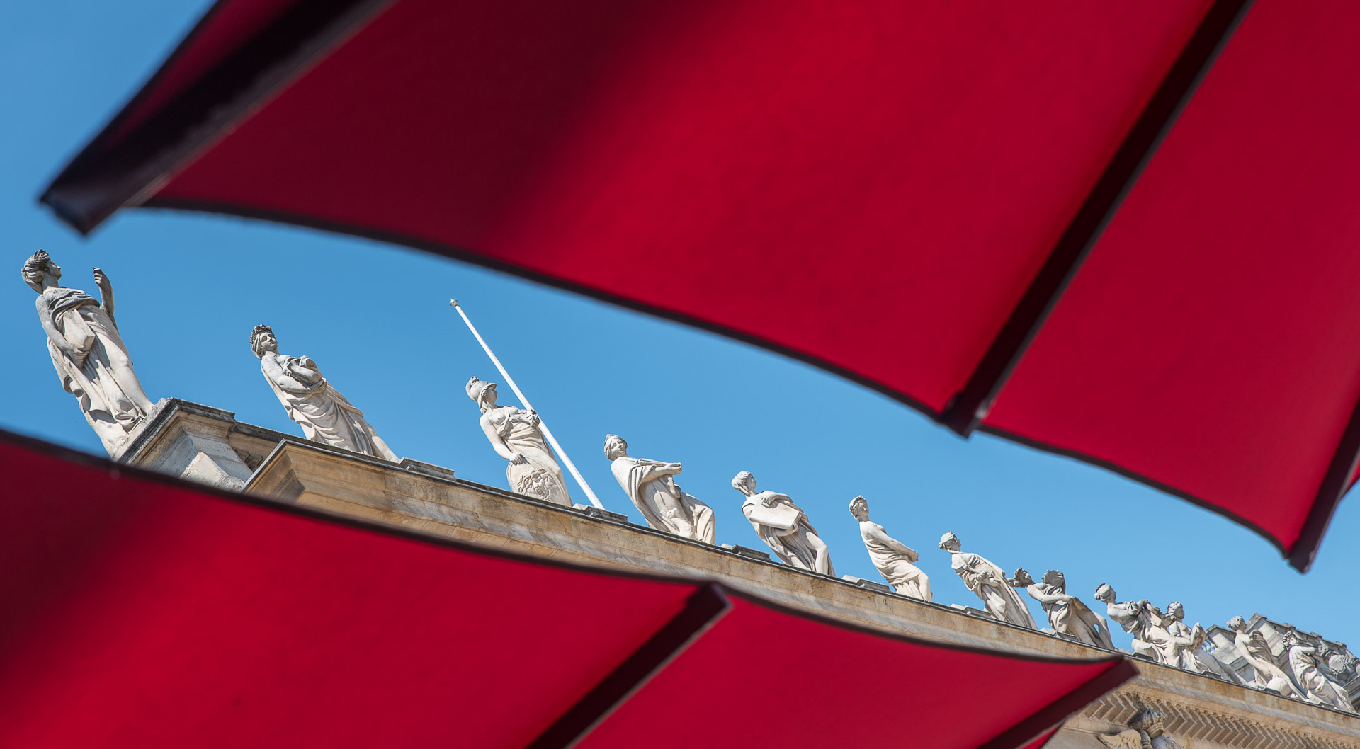 Estatuas en el techo del Gran Teatro vistas desde una terraza cercana.
