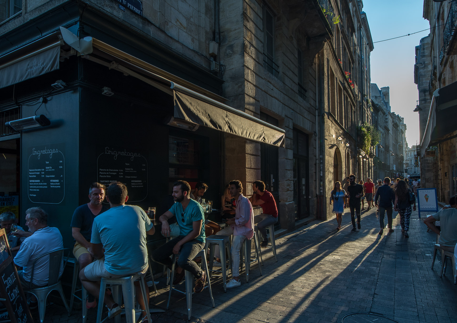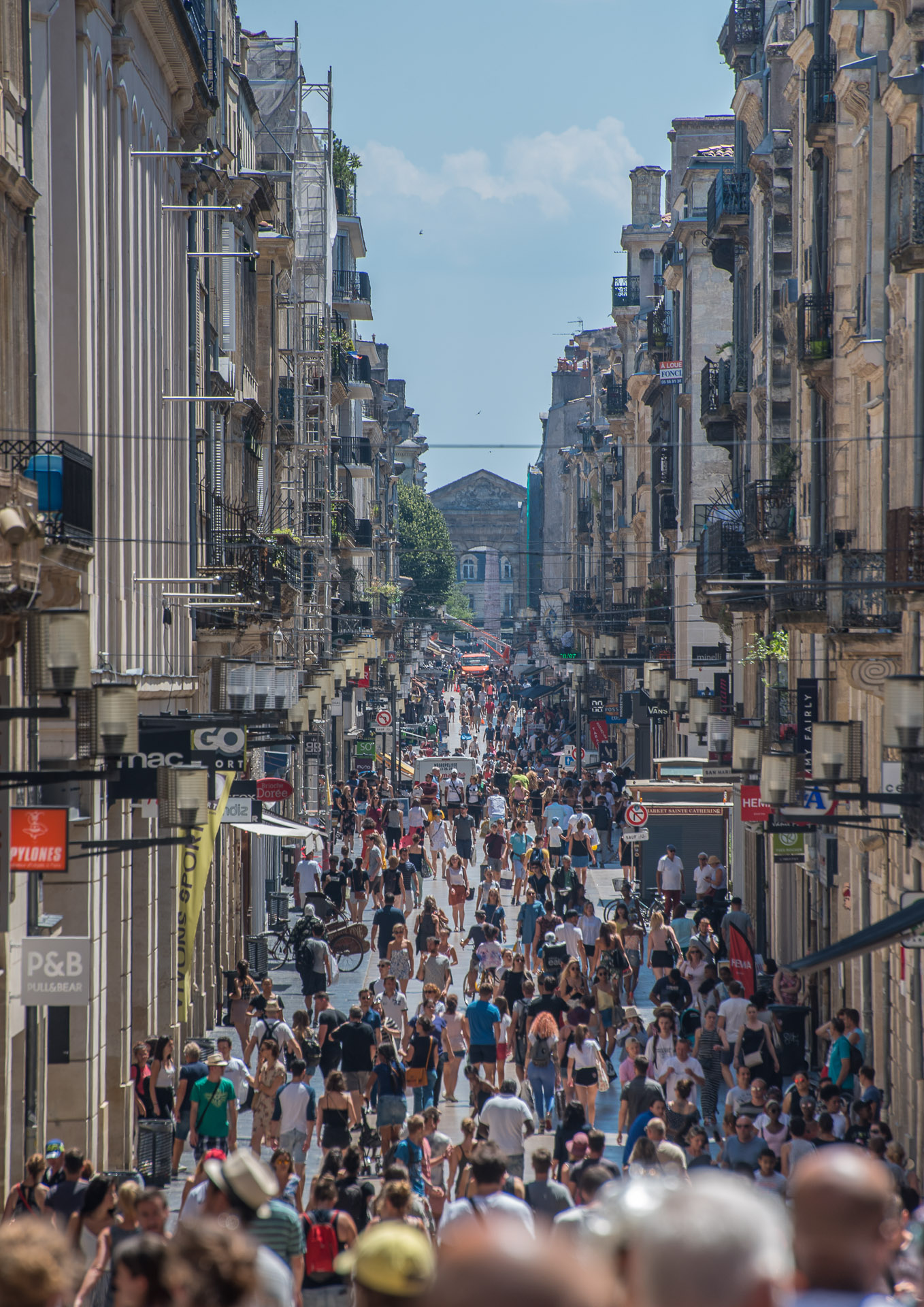Una de las calles del centro de Burdeos, llenas de restaurantes, tiendas, cafés y, por supuesto, gente.