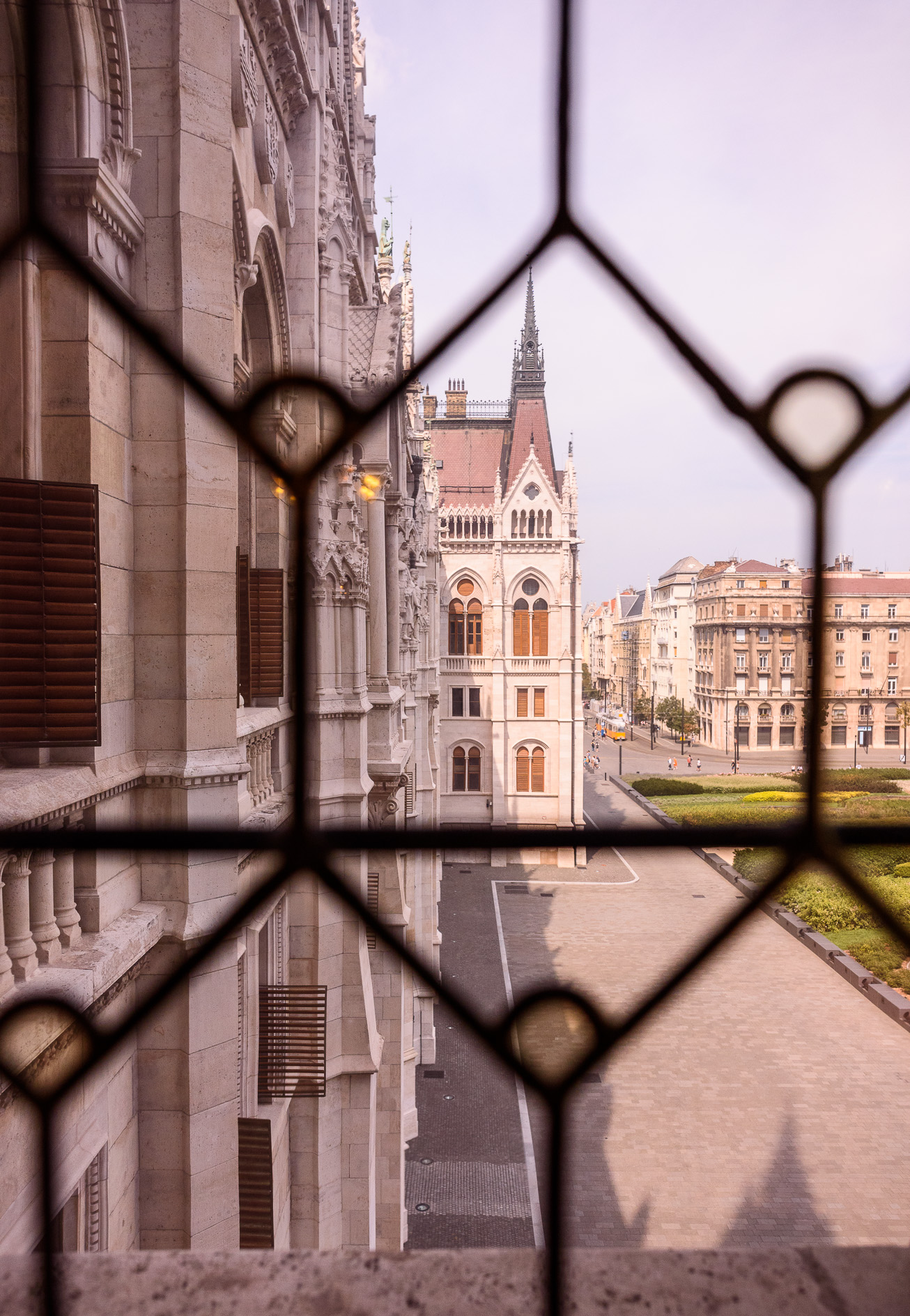 La vista del exterior desde una de las ventanas del parlamento de Budapest.