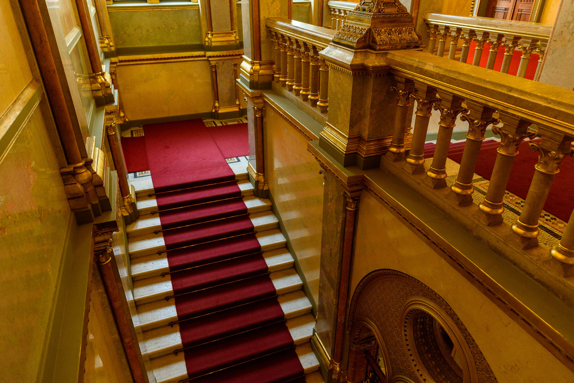 Una de las escaleras por las que se sube al segundo piso del parlamento. Todo el recorrido está tapizado por una impoluta alfombra.