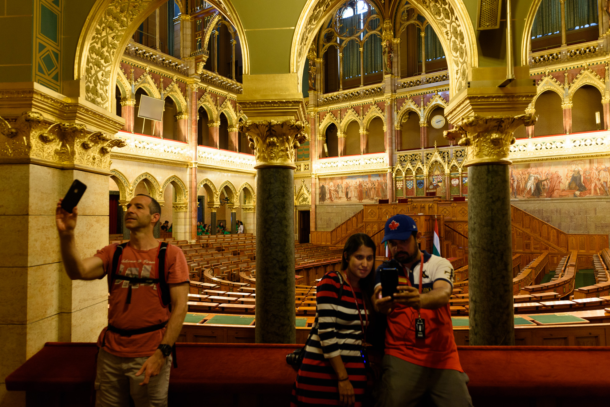 Varios turistas ser fotografían en el interior de la Cámara donde los diferentes grupos políticos del parlamento húngaro debaten.