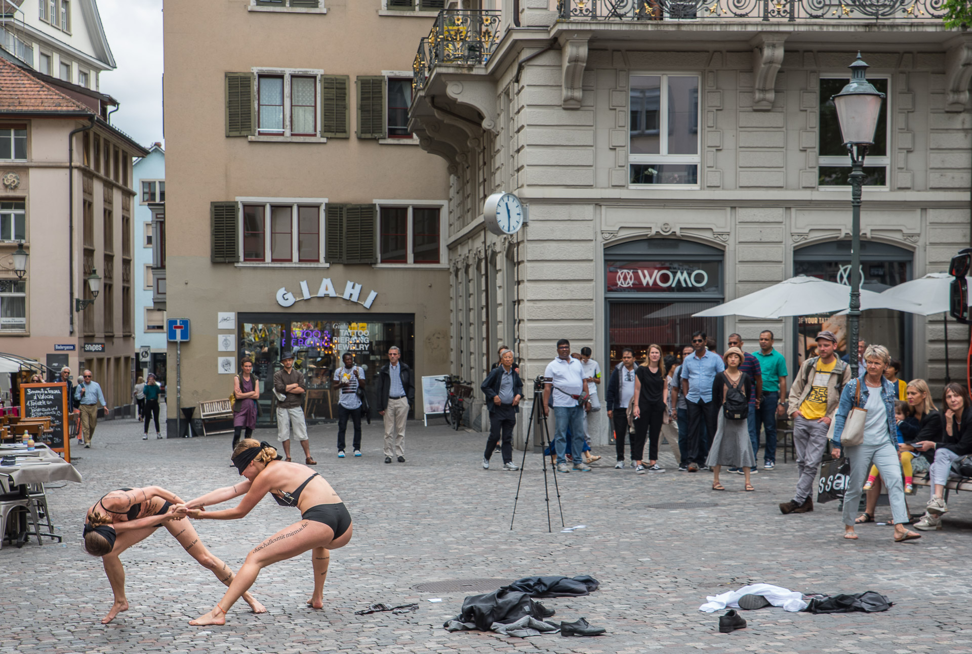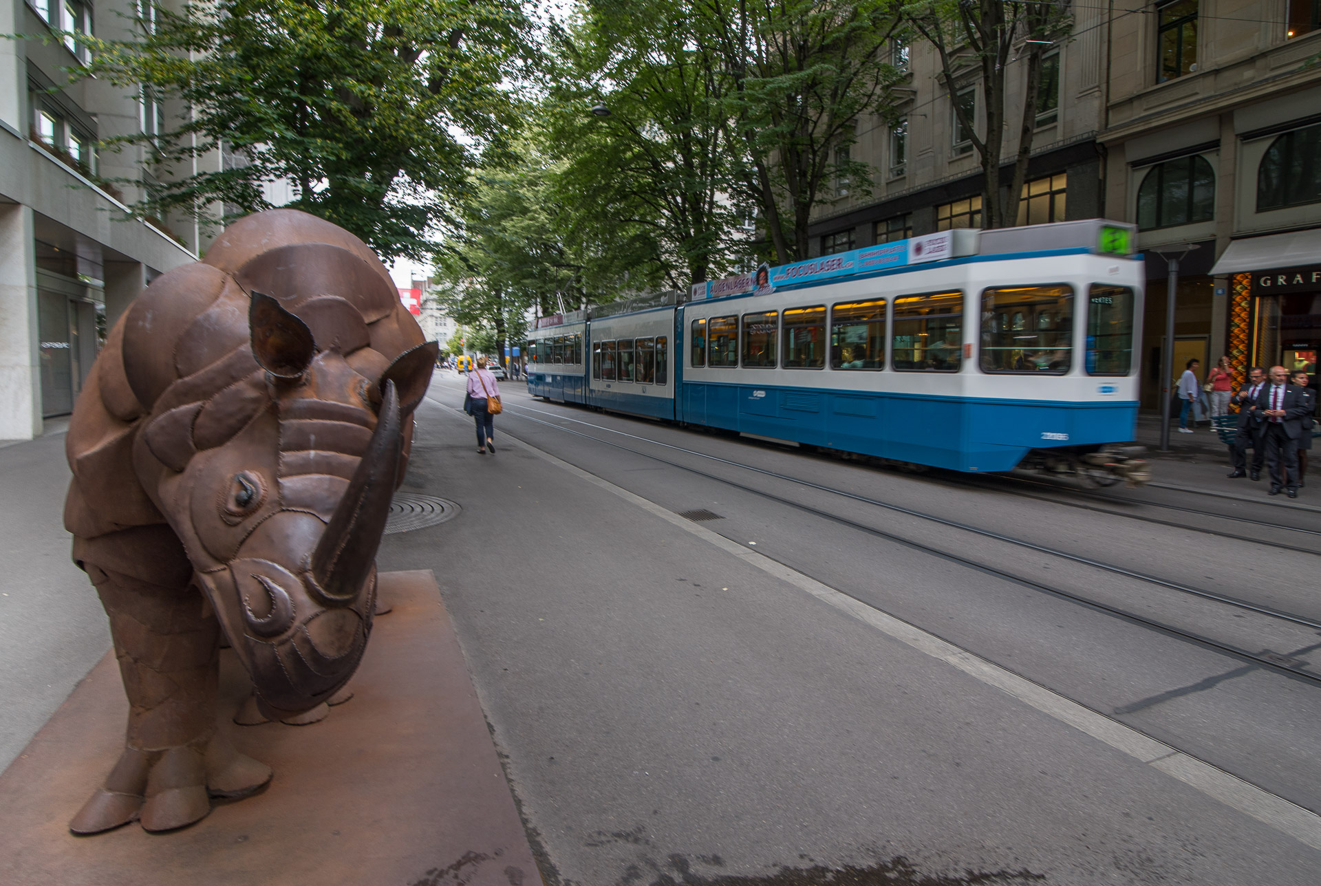 Una llamativa escultura y uno de los tradicionales tranvías azules y blancos de Zúrich.