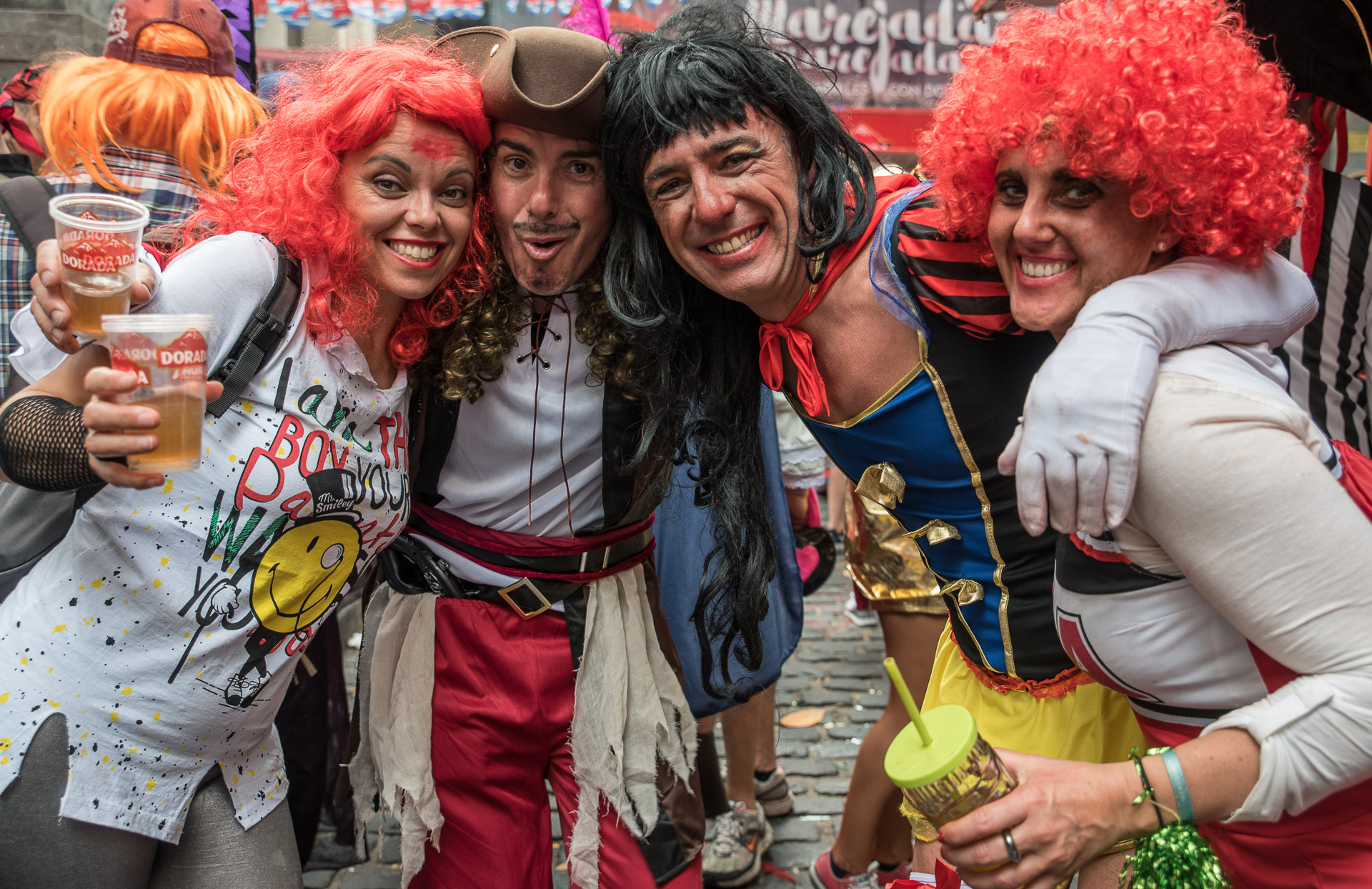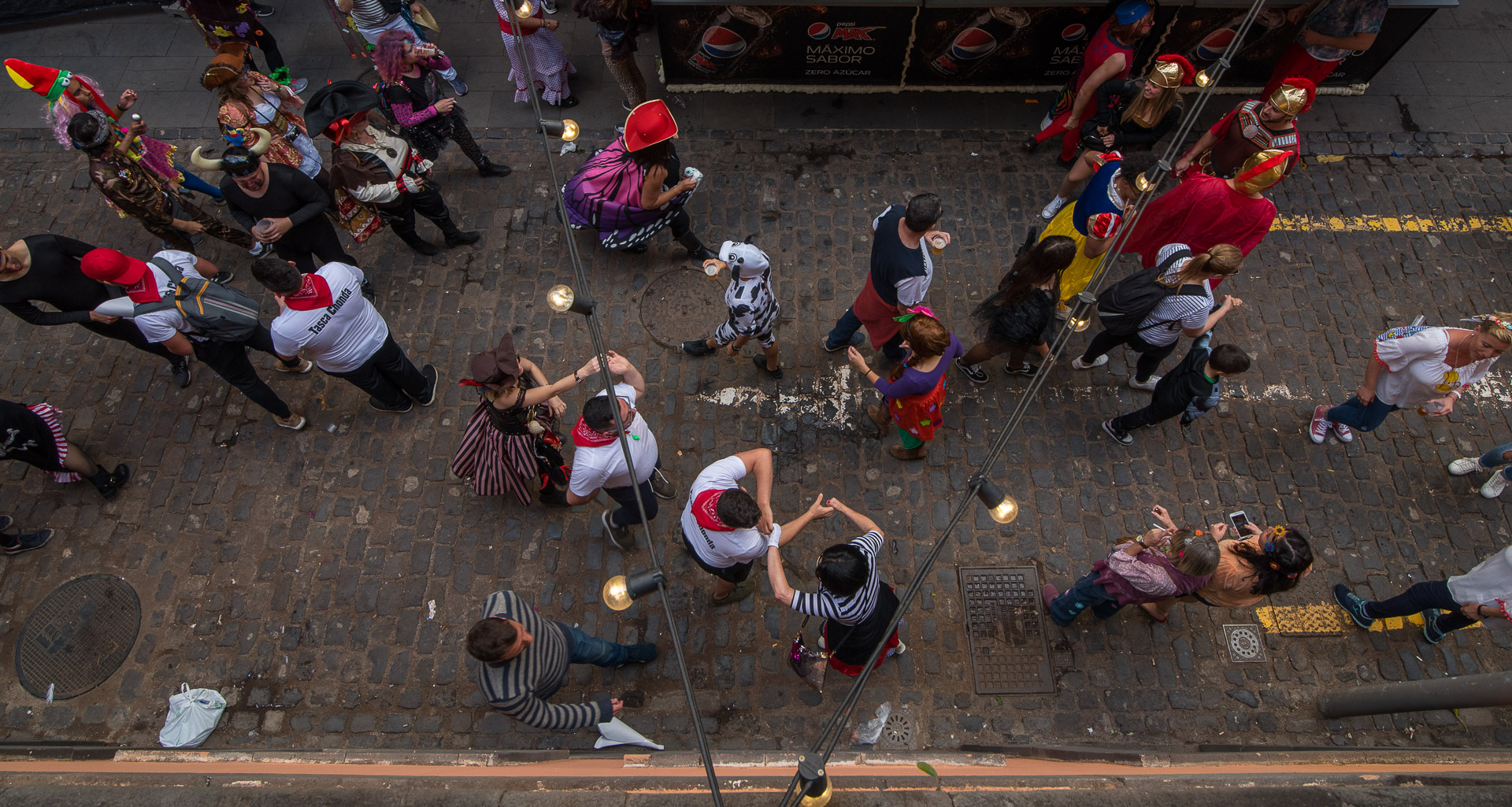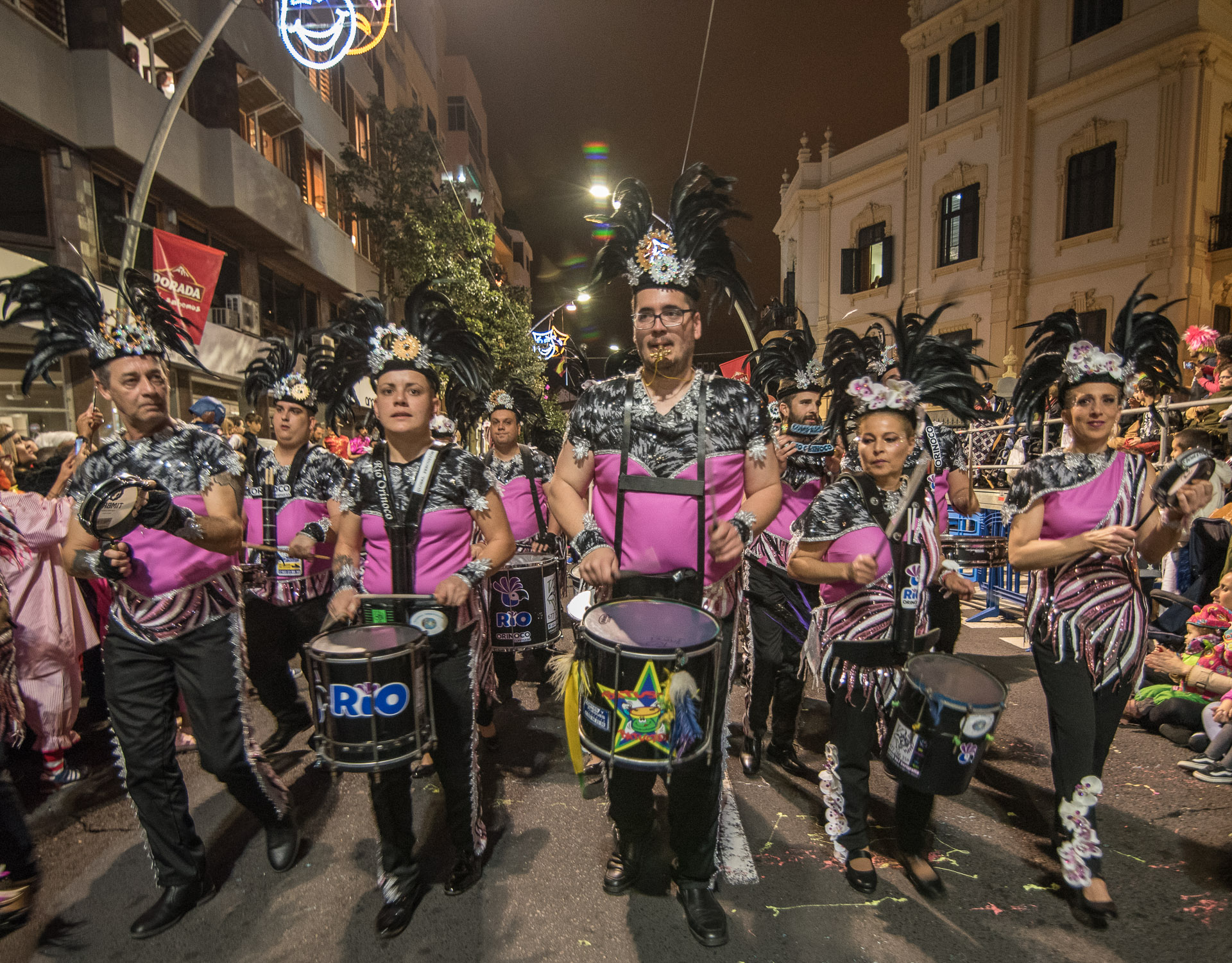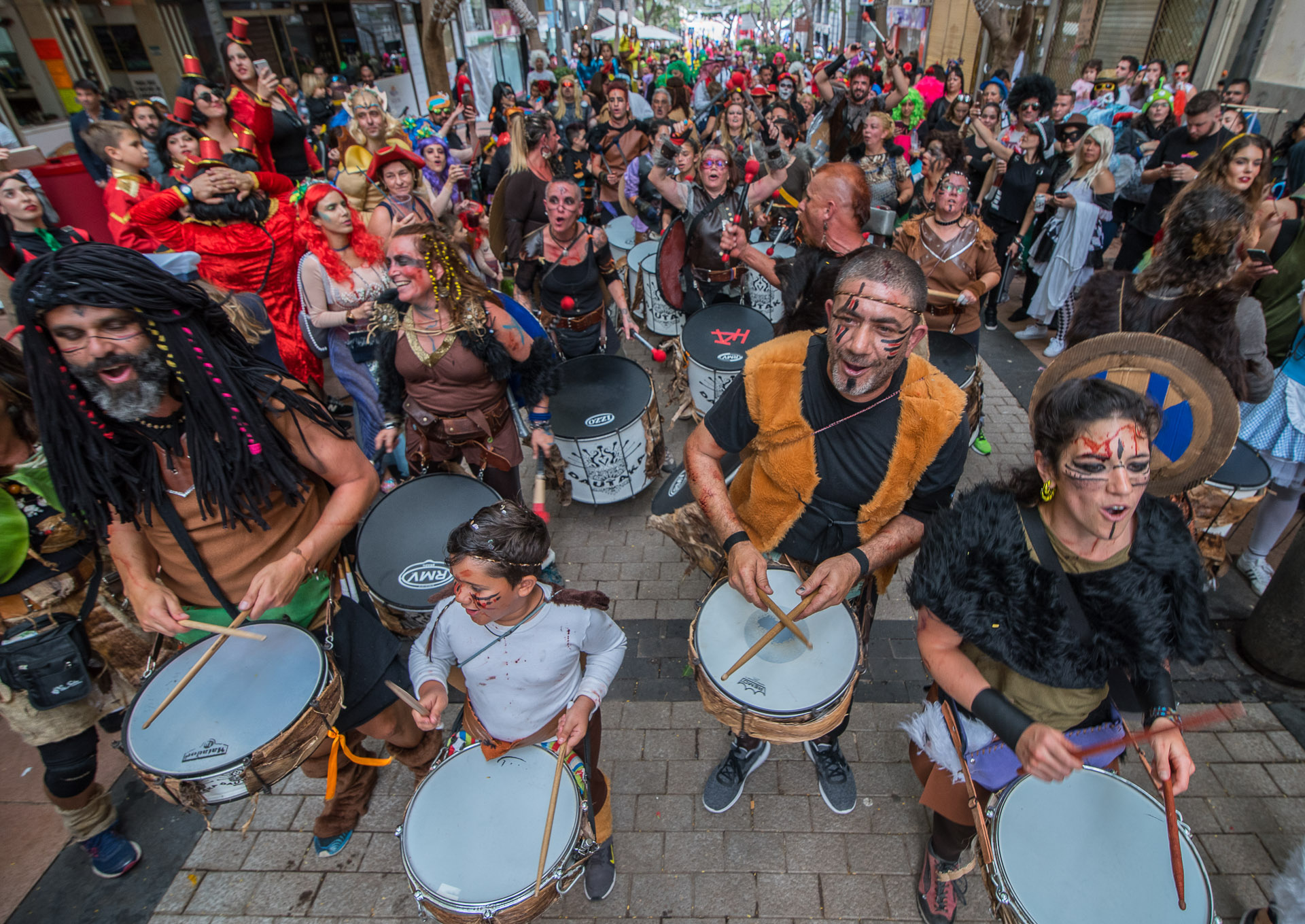 Un grupo de percusión ha ocupado una de las calles del centro de Santa Cruz y la fiesta se ha agolpado en torno a ellos.