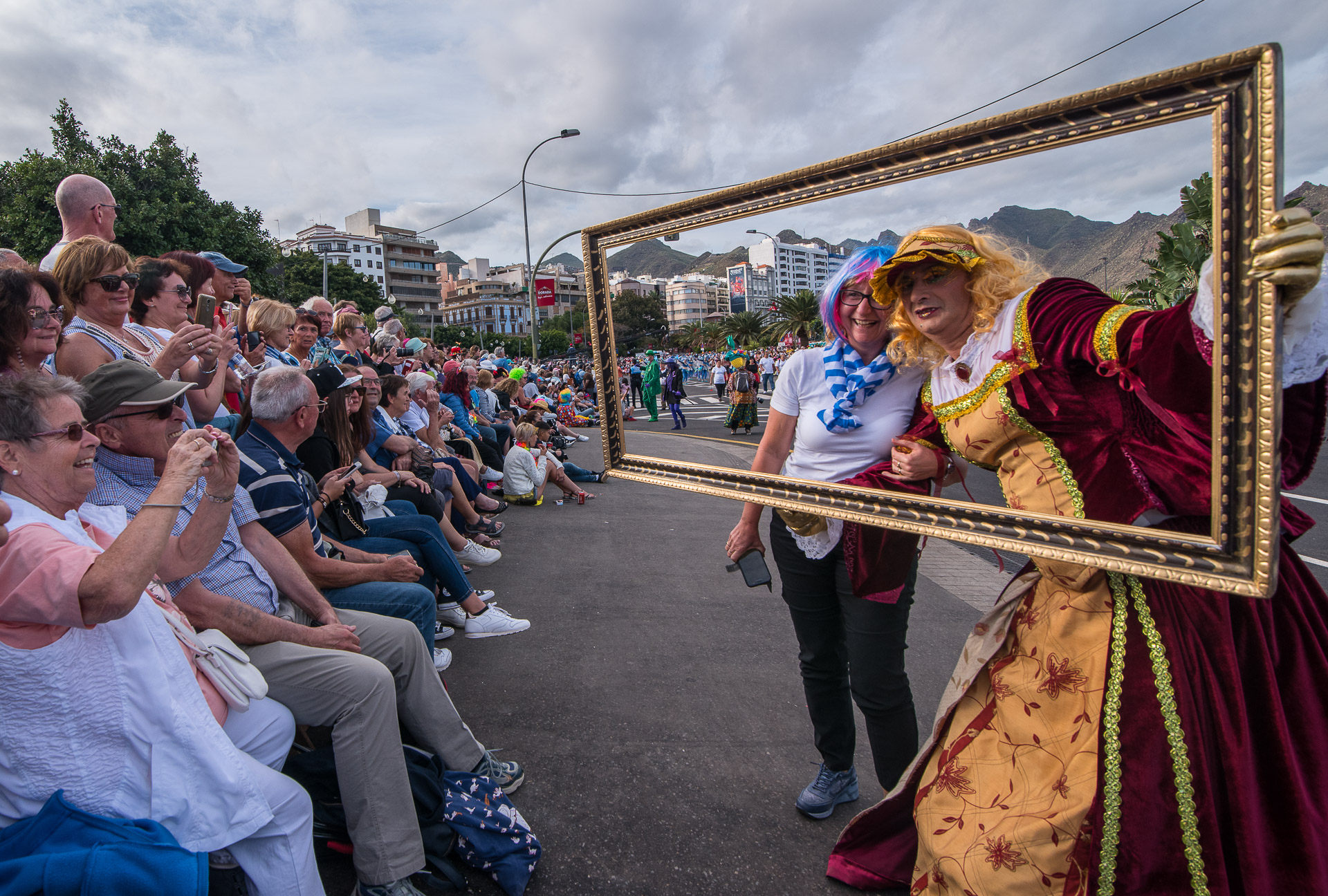 Algunos de los que desfilan disfrutan interactuando con el público, como esta mujer del cuadro que ha estado retratándose con docenas de personas.