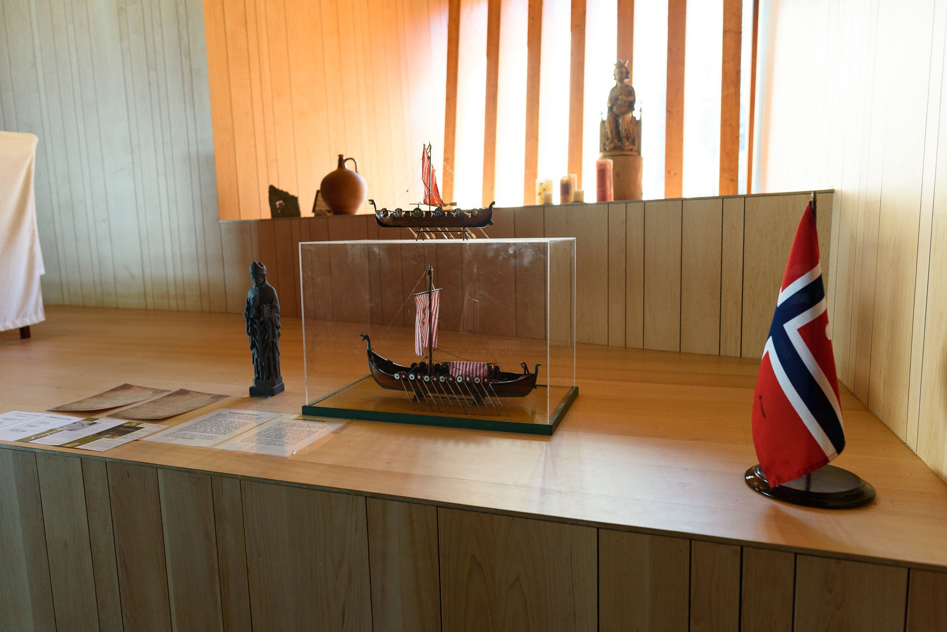 En el interior del templo, diferentes detalles nórdicos y la bandera de Noruega.