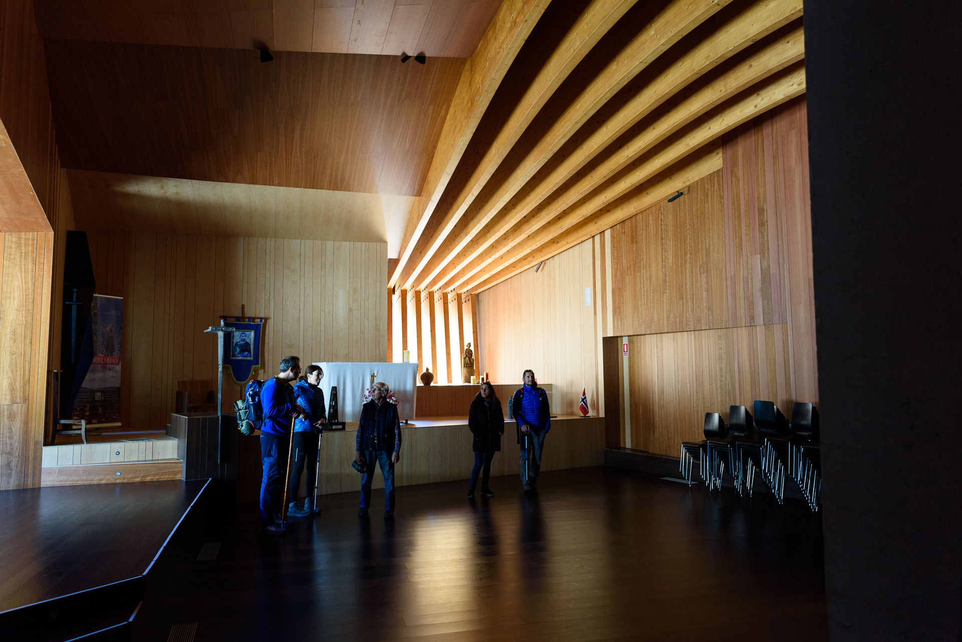 Por dentro está decorada con madera, con un techo al más puro estilo de la tradición noruega, imitando un barco Drakkar invertido.