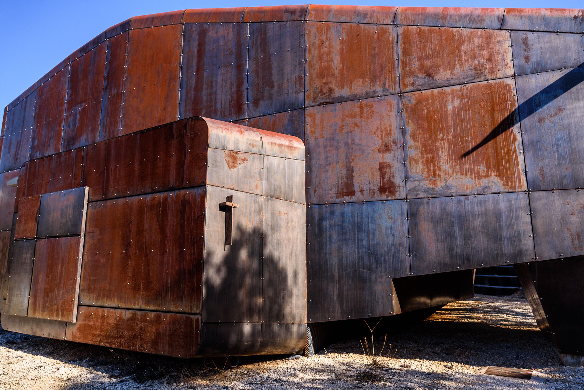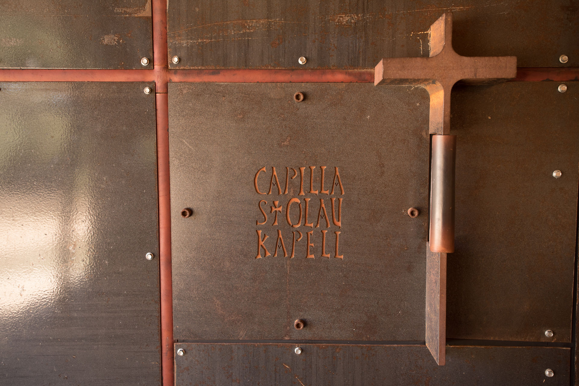 Una vista general de la capilla de San Olav, con un diseño por fuera de metal con incrustaciones de cuero y símbolos vikingos.