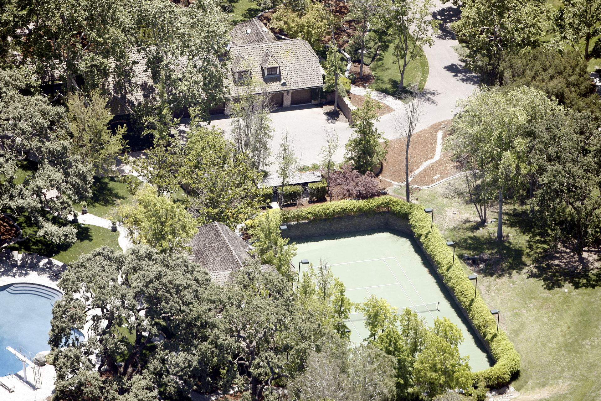 El pabellón de tenis incluye un desván, chimenea, lavandería, dos baños y una bodega subterránea con un bar.