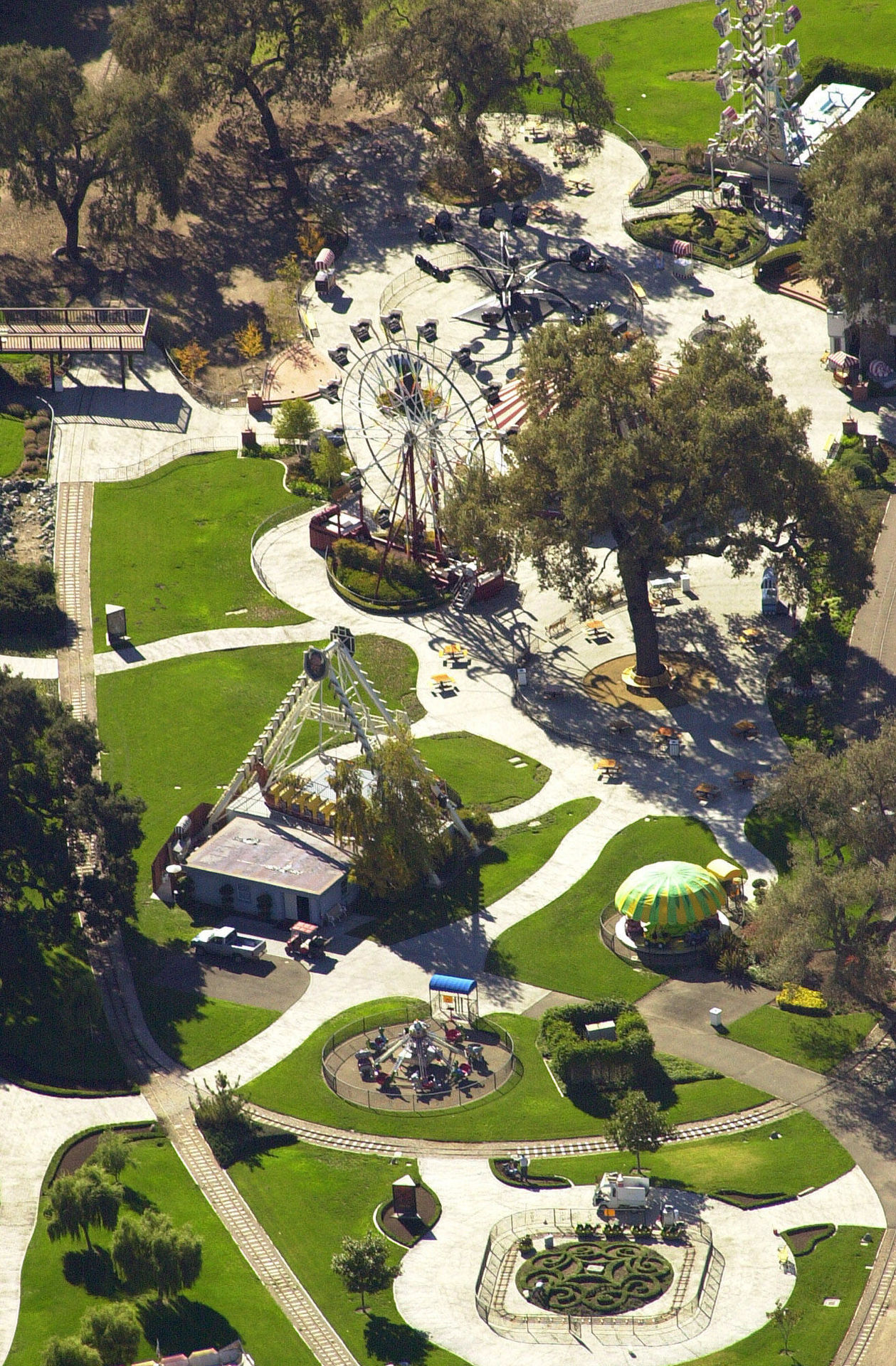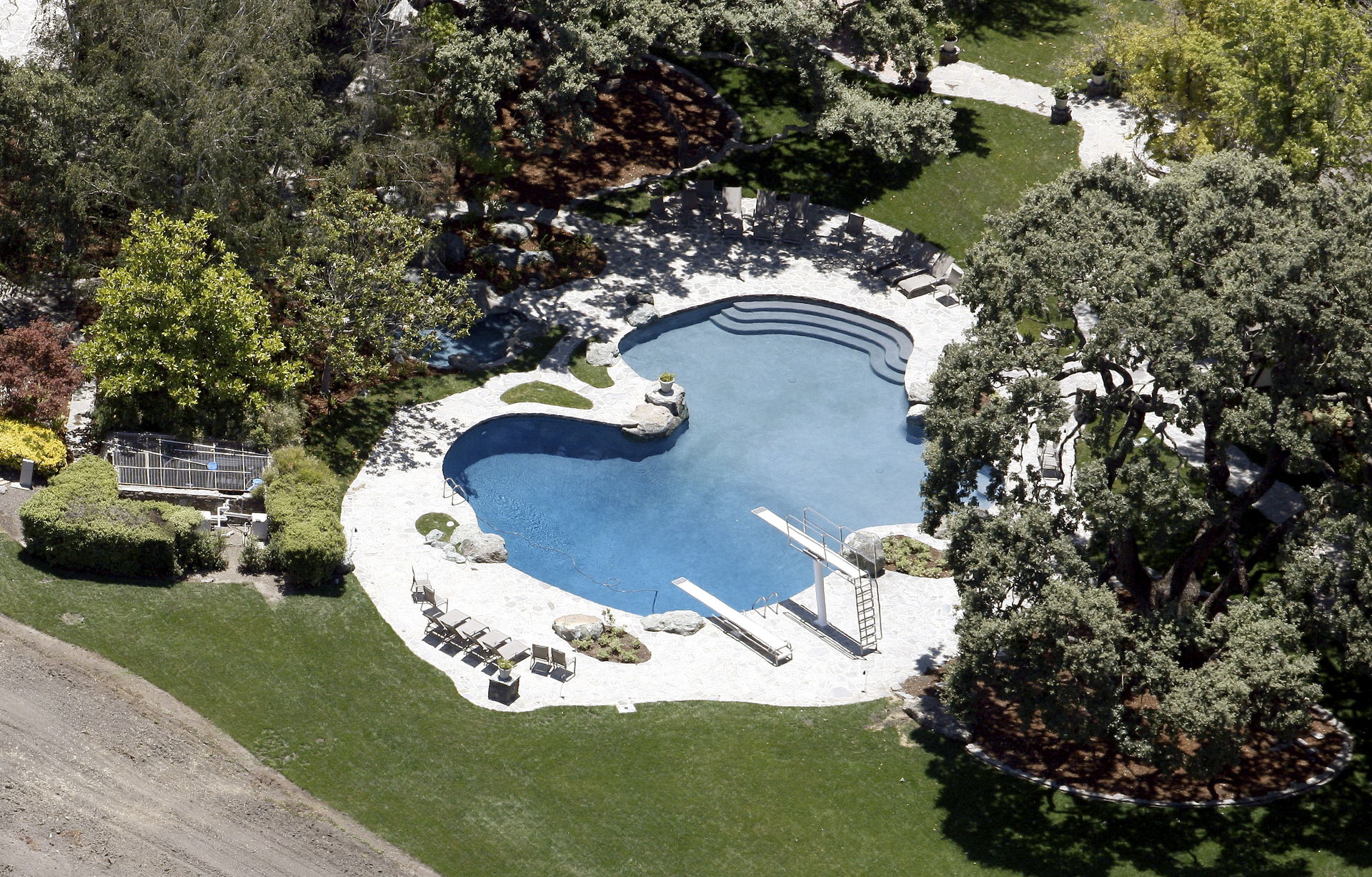 Vista aérea de la piscina, casas de invitados y la estación de tren.