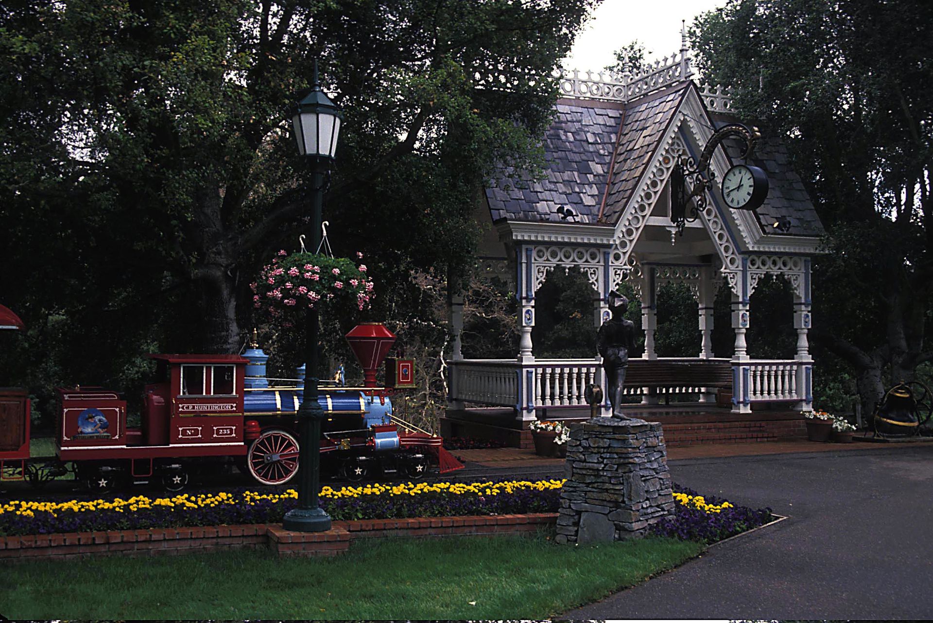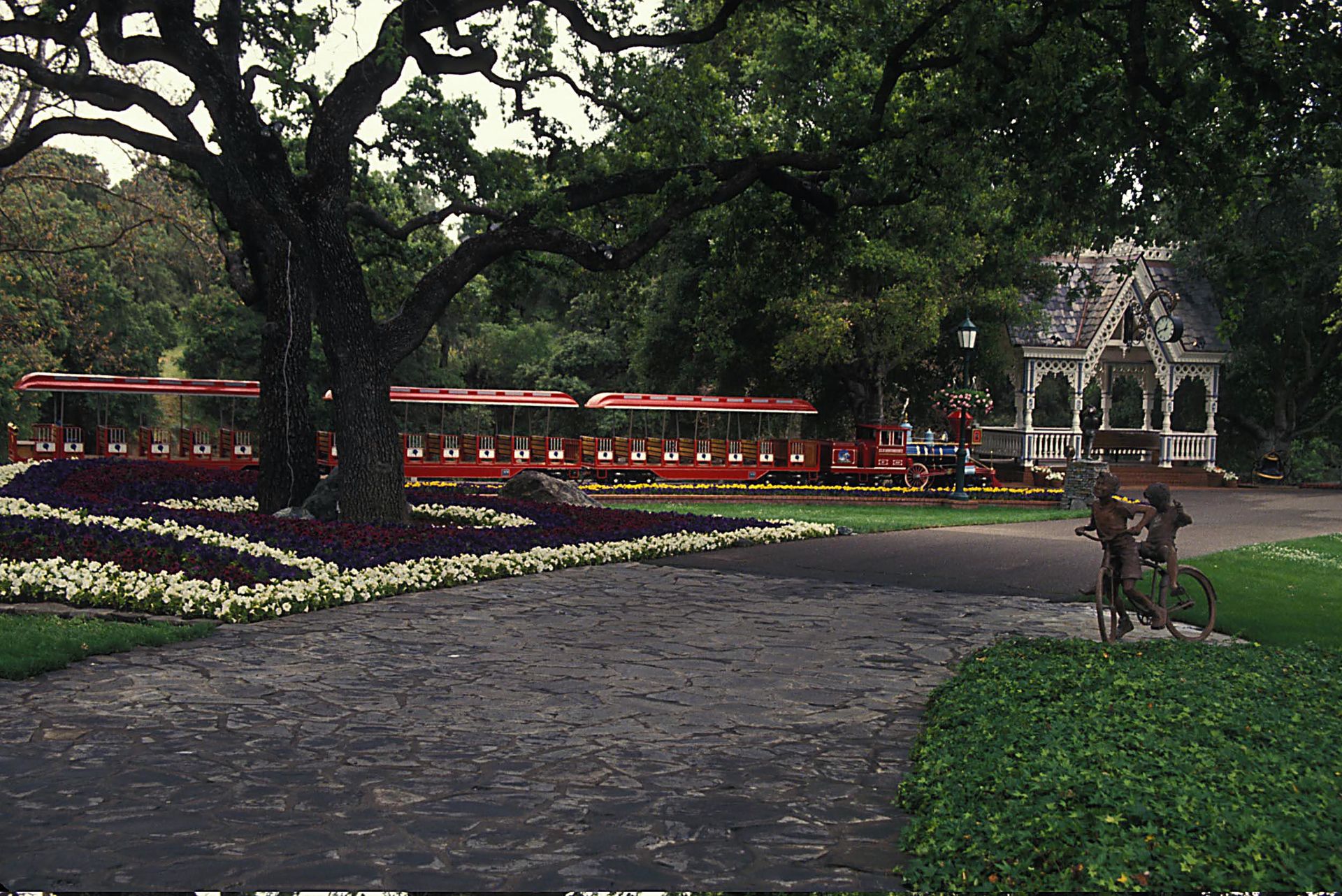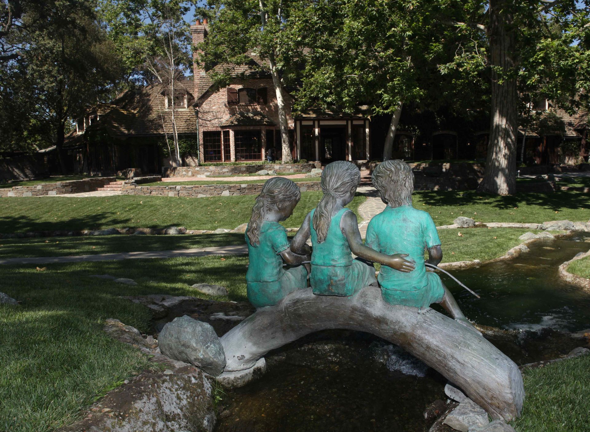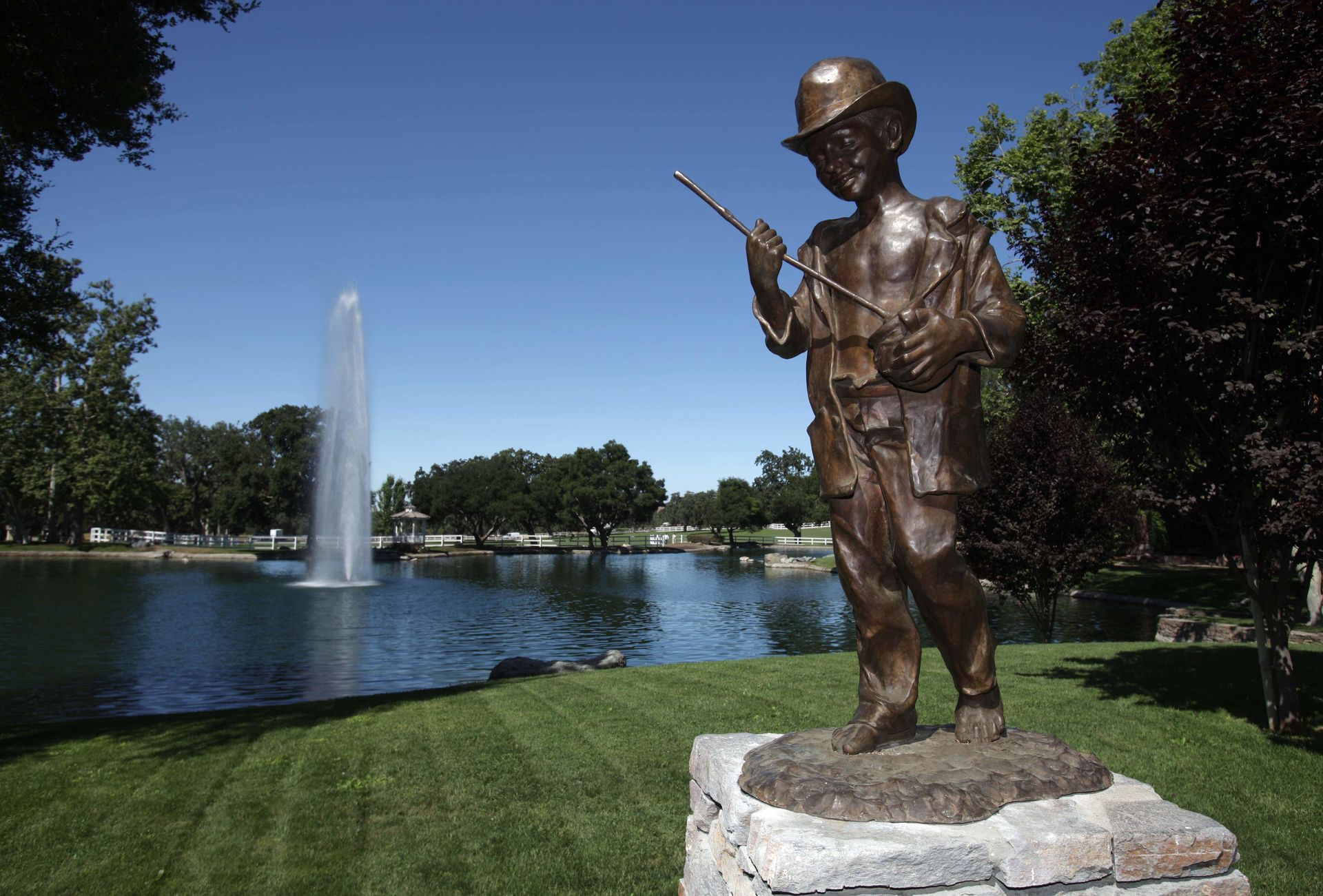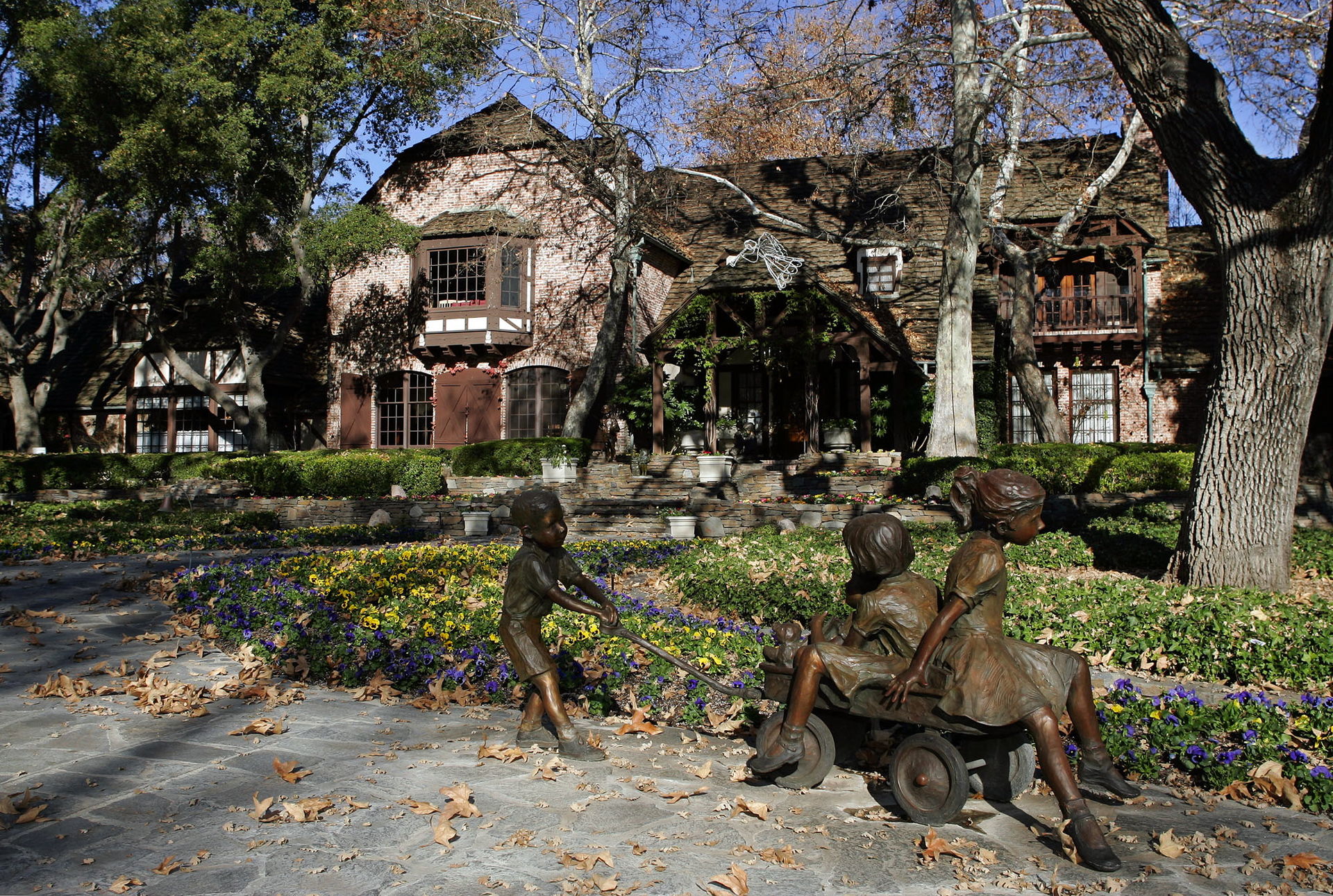 En Neverland hay numerosas estatuas infantiles. Al fondo, el trenecito que movía a los visitantes por la propiedad.