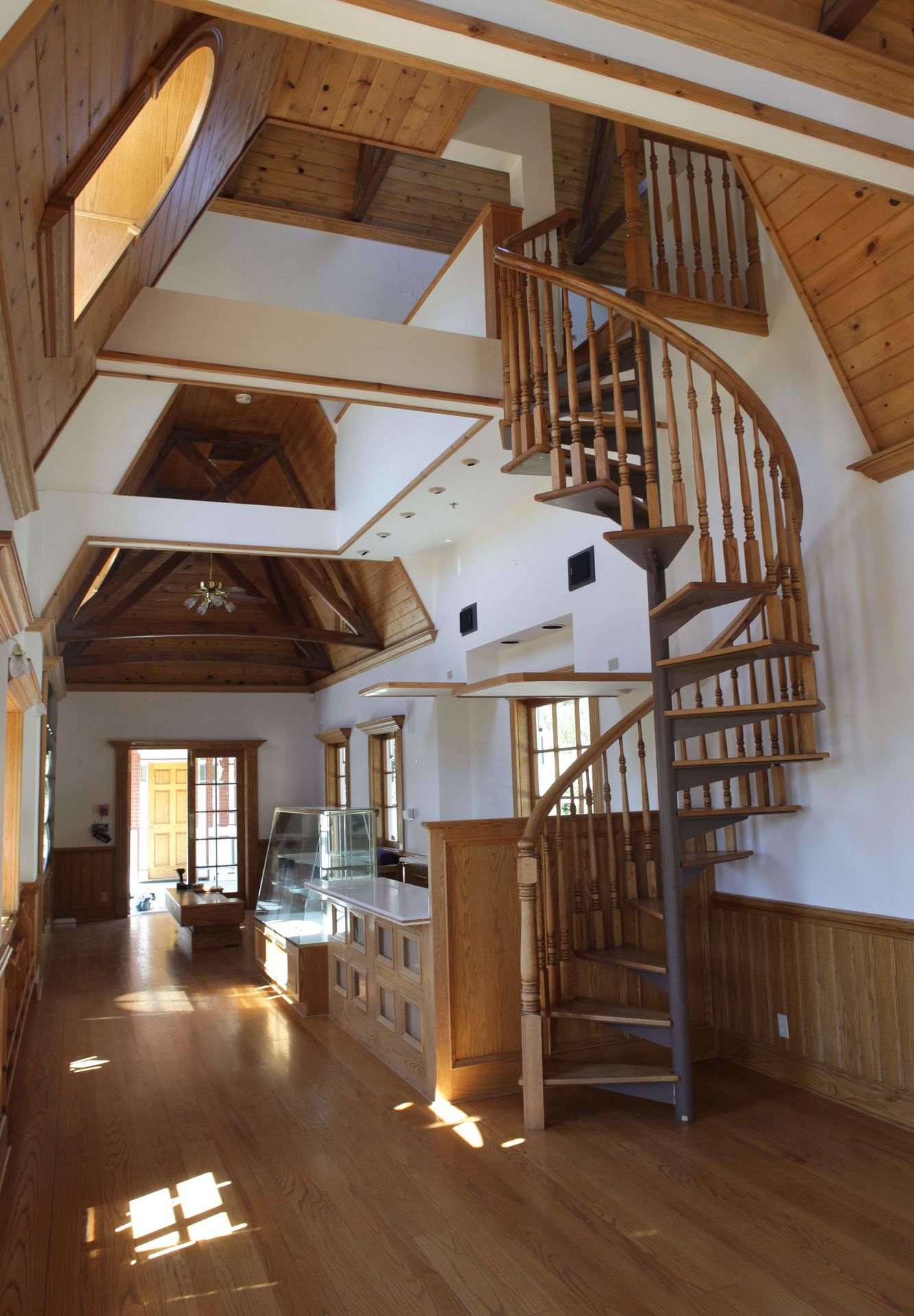 La estación de tren por dentro con una pequeña cafetería y una escalera en espiral.