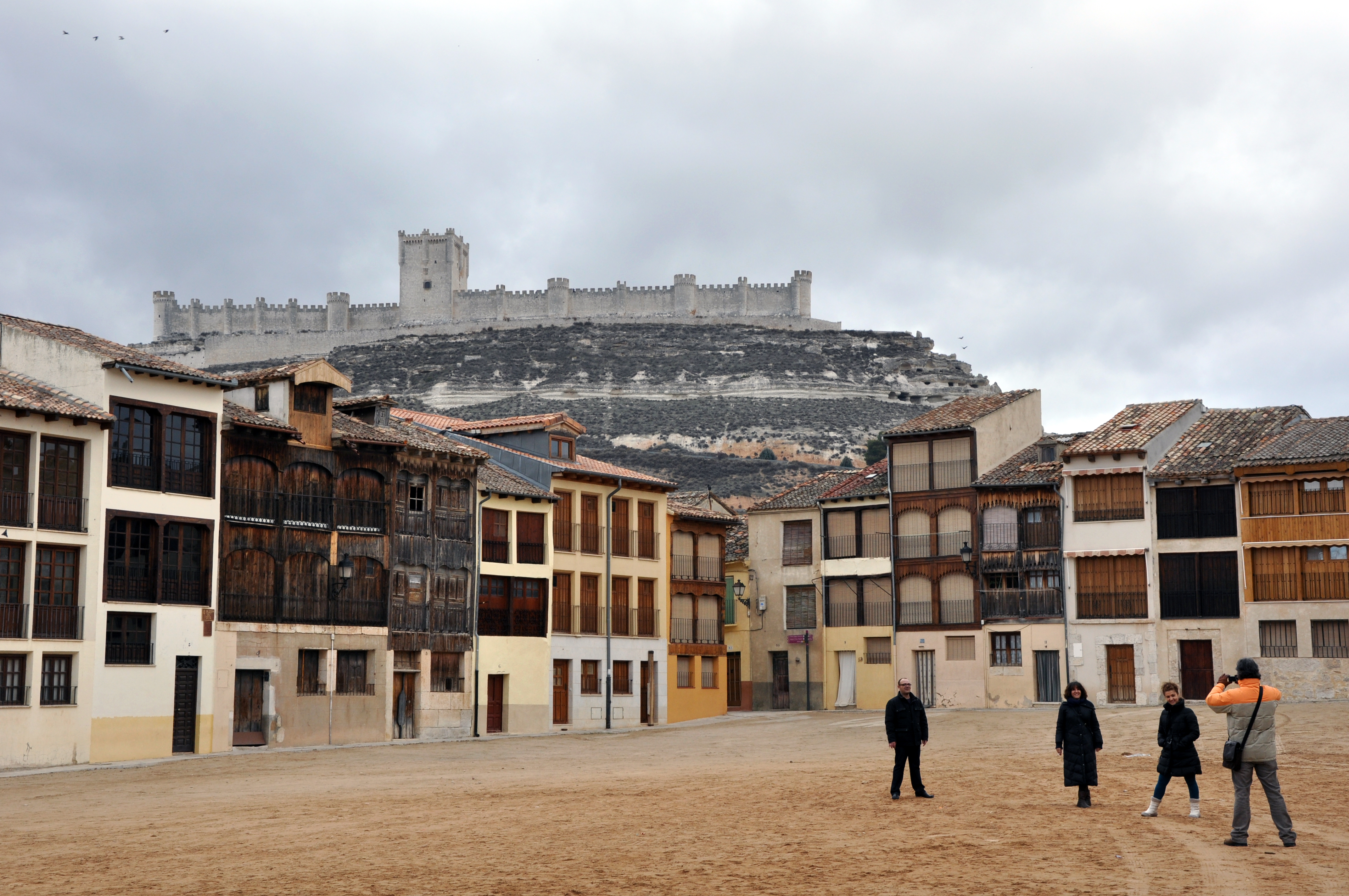 En plena Ribera del Duero y en la provincia de Valladolid, Peñafiel no sólo está coronada por uno de los castillos más espectaculares de España -hoy convertido en un interesante Museo del Vino- sino que cuenta con muchas cosas que nos transportan a la edad media: su peculiar Plaza del Coso -en la imagen-, bodegas con galerías bajo la montaña excavadas siglos atrás o edificios como el Convento de San Pablo