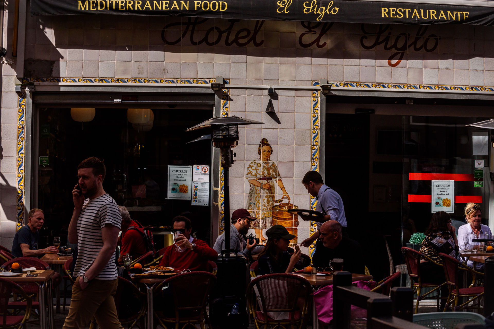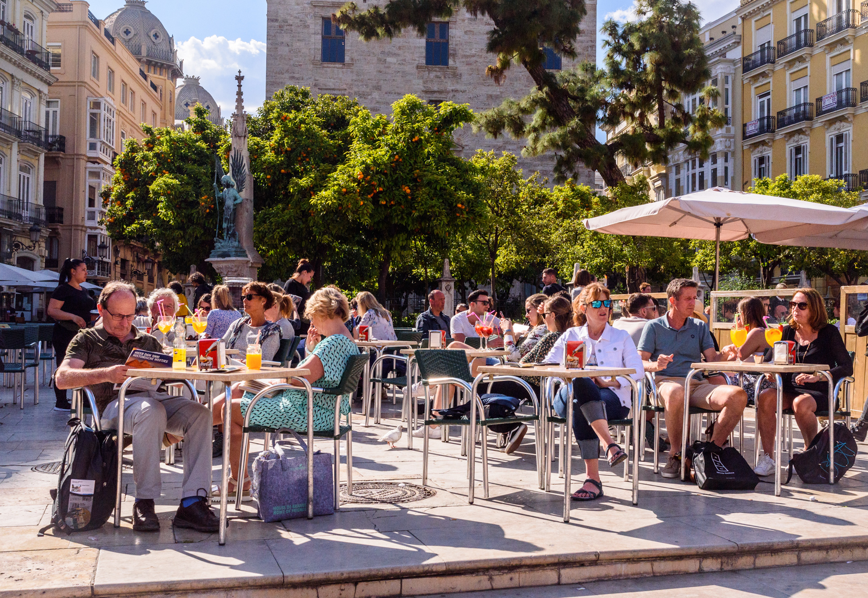 Varios turistas y valencianos comiendo en uno de los restaurantes de la zona antigua de Valencia.