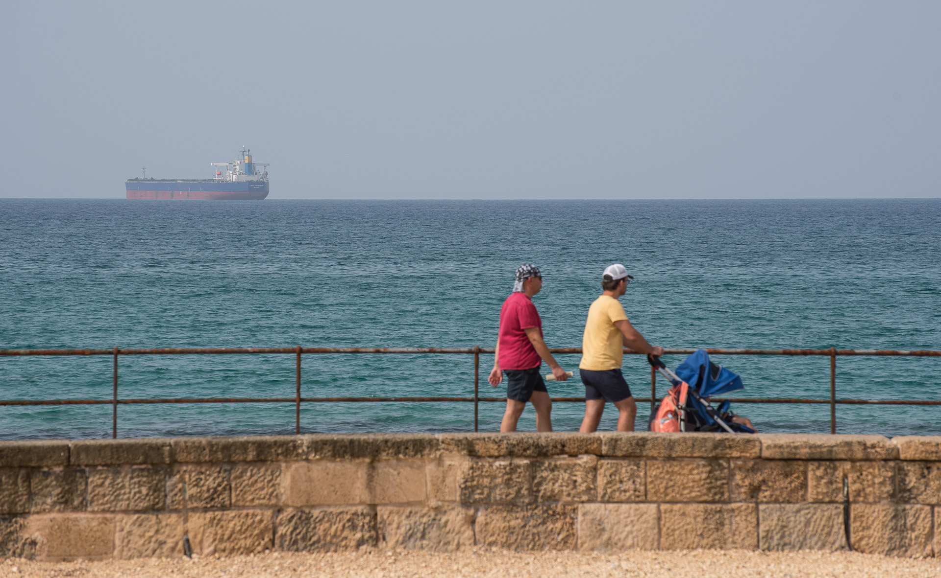 Una pareja de turistas pasea junto al mar en Cesarea, con un barco carguero al fondo.