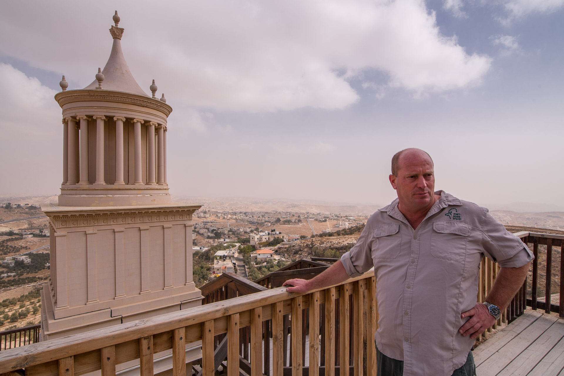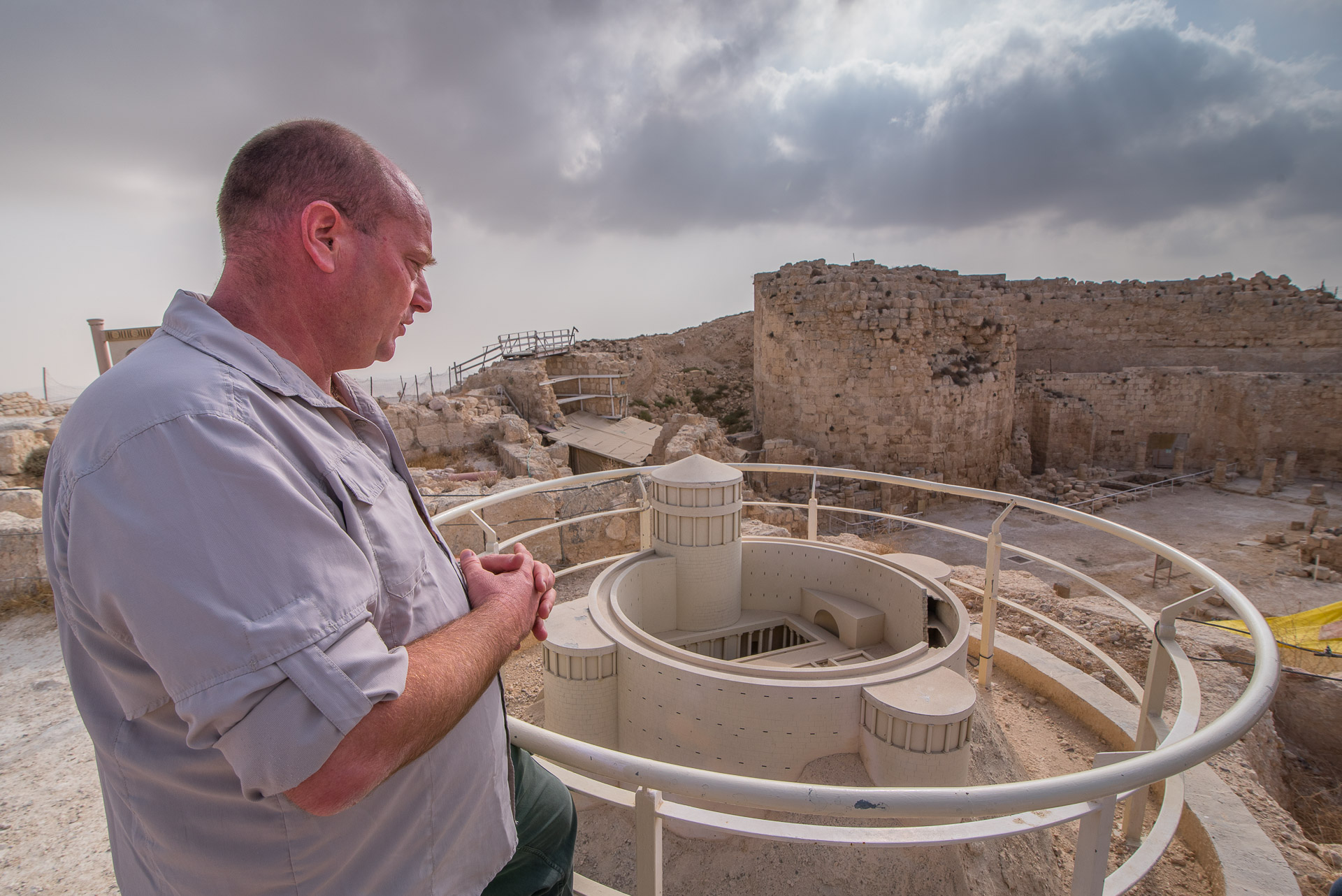Uno de los responsables de las excavaciones en Herodión muestra una maqueta de cómo era la fortaleza mientras nos explica que sólo se ha excavado el 20% del sitio arqueológico.