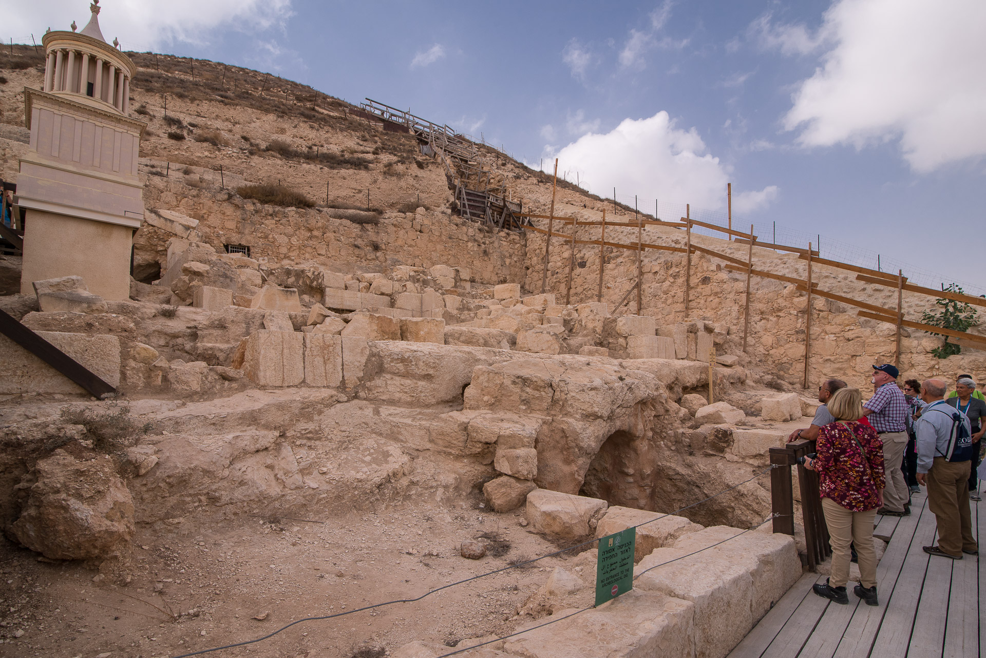 Turistas contemplan el lugar en el que estaba la tumba de Herodes y la reproducción que a escala que se puede ver en el mismo lugar.